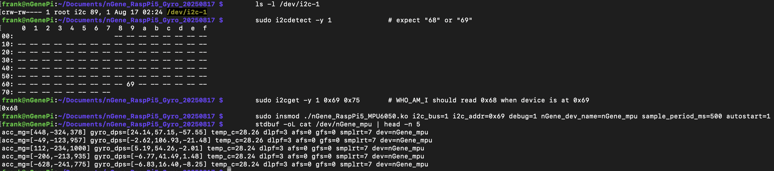 Permissions: default device node is typically 0600; use sudo or adjust perms for quick tests (sudo chmod 666 /dev/nGene_char_driver).