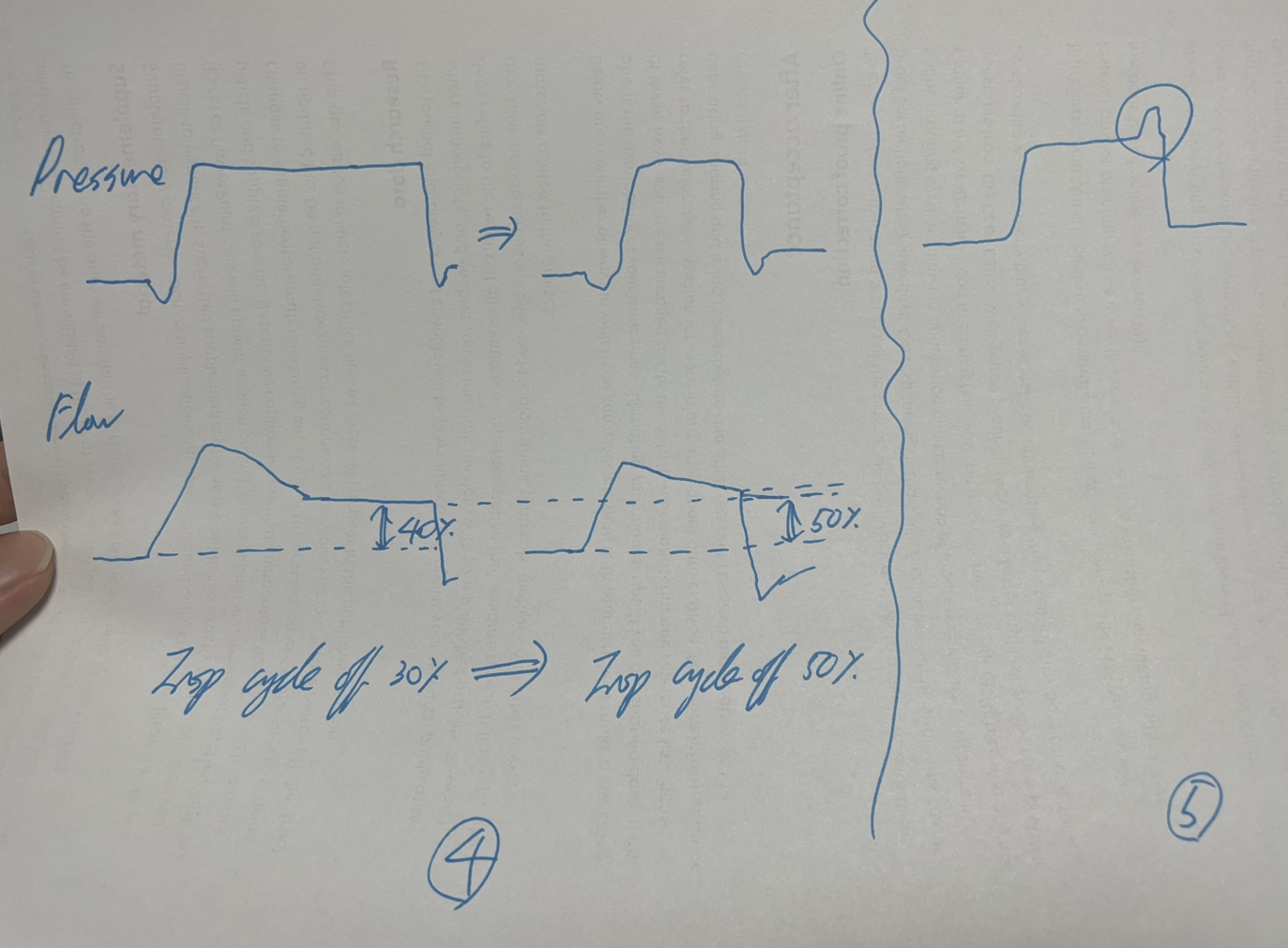 The Lower Inflection Point (LIP) on the pressure-volume loop provides crucial insights into the patient's respiratory mechanics. If the LIP shifts slightly to the right, it often correlates with airway obstruction, such as the presence of sputum, indicating that higher pressure is needed to overcome the resistance and begin inflating the lungs. Conversely, if the LIP remains the same or appears swollen (wider), it may suggest intrinsic lung issues, such as reduced lung compliance seen in conditions like ARDS or fibrosis, where the lung tissue is stiffer and harder to inflate. Increased airway resistance typically causes a rightward shift of the LIP without necessarily causing it to swell. Understanding these differences helps clinicians make informed decisions about ventilator management and patient care.Note: It is crucial to customize all ventilator settings to the individual needs of the patient, considering their specific medical conditions, responsiveness to initial settings, and changes in their clinical status. This guide provides a foundational framework and should be utilized in conjunction with the latest clinical guidelines and under the supervision of experienced clinicians.