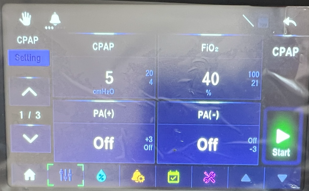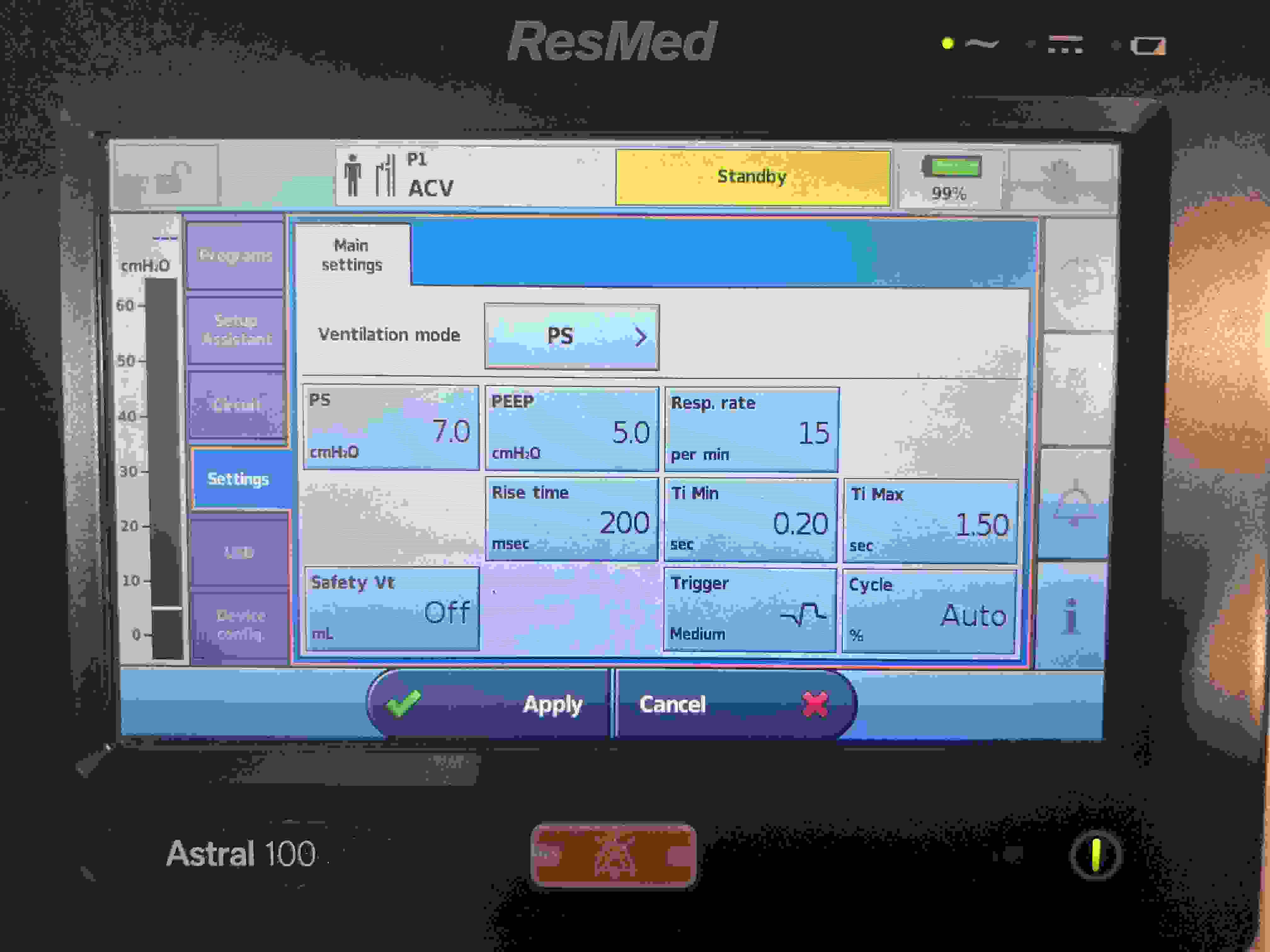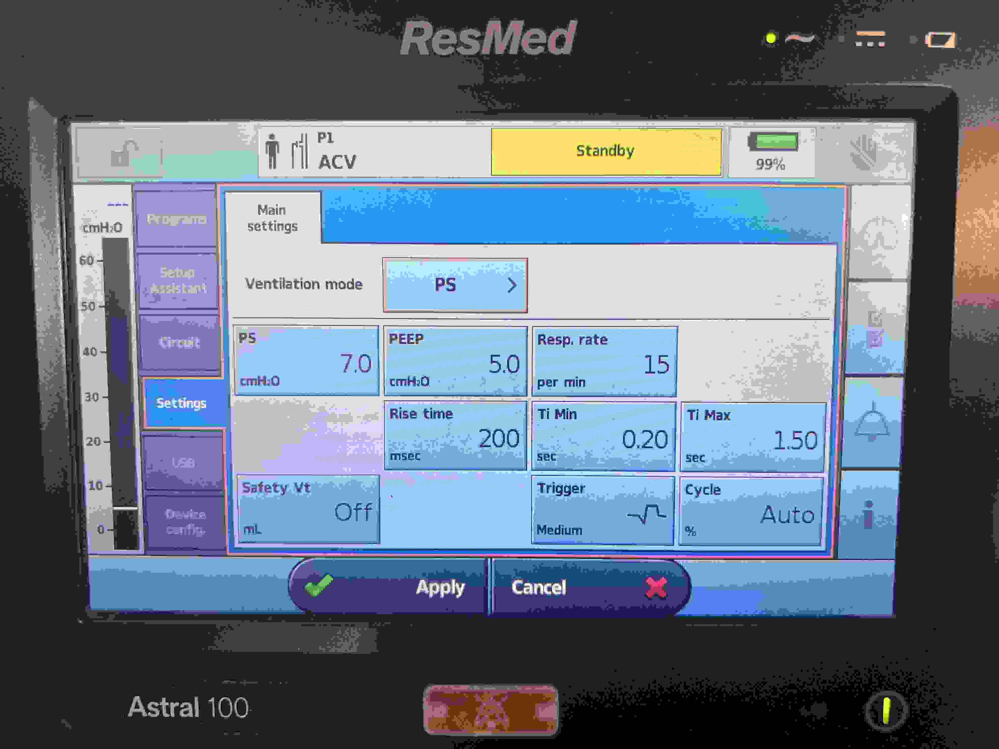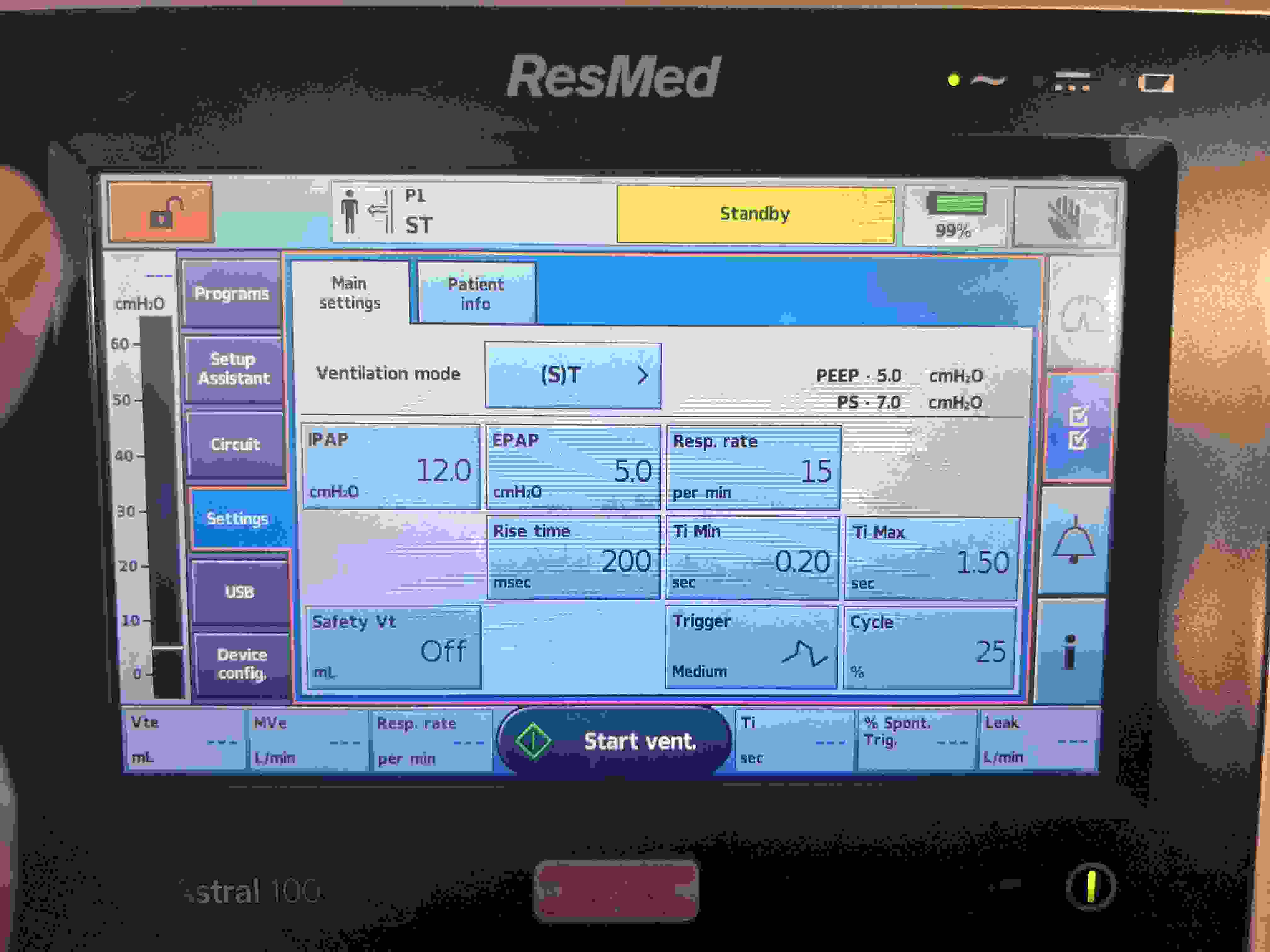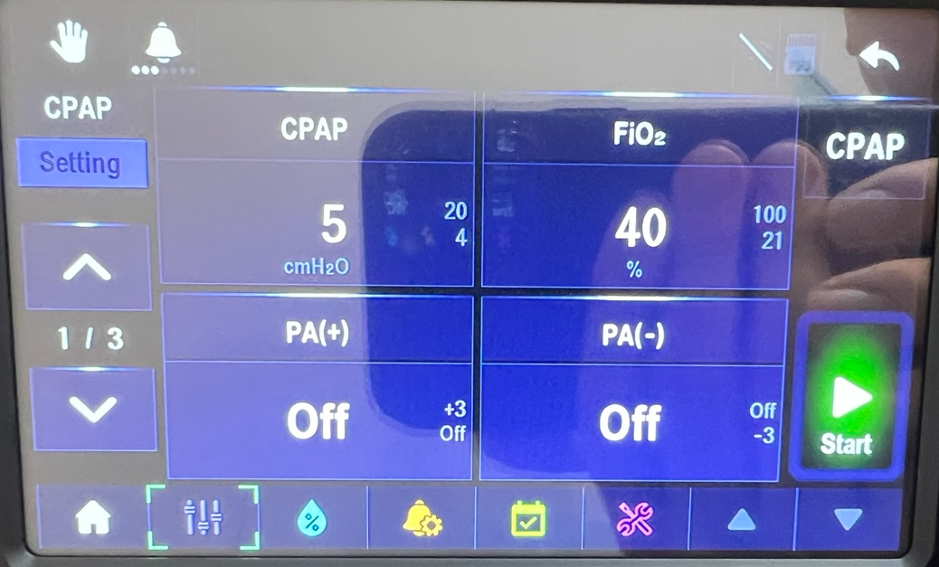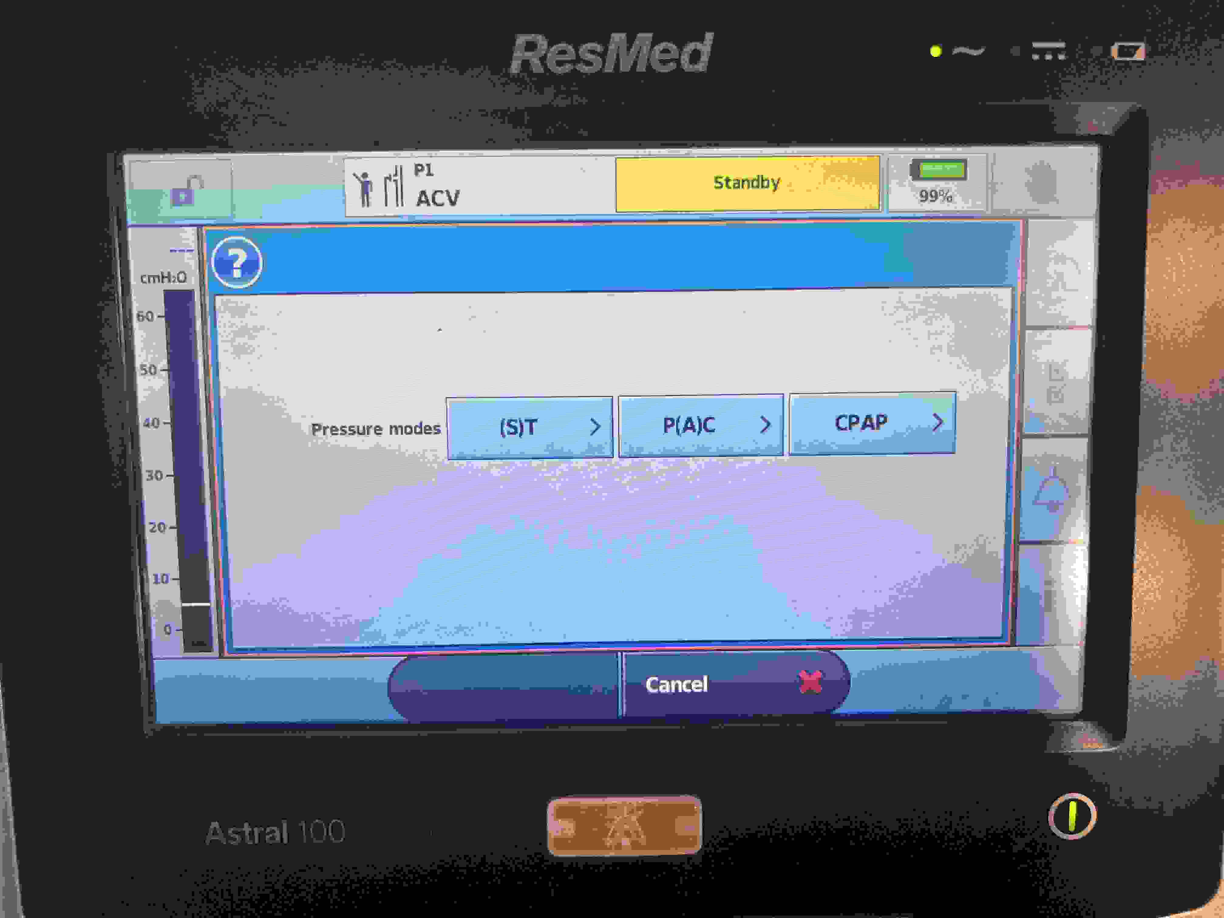 A patient in a stuporous state is receiving mechanical ventilatory support via an Astral 100 device in pressure support (PS) mode. This long-term care setting has limited immediate diagnostics: arterial blood gas analysis and emergency chest radiography are not readily available. In light of these constraints, a plan is being considered to transition the patient from the current invasive ventilator support to a high-flow therapy-capable device (such as the HFT700) that can function as a CPAP/BiPAP machine and also deliver high-flow nasal oxygen. The approach would involve initiating support with BiPAP and, once the patient stabilizes, transitioning to high-flow oxygen therapy.