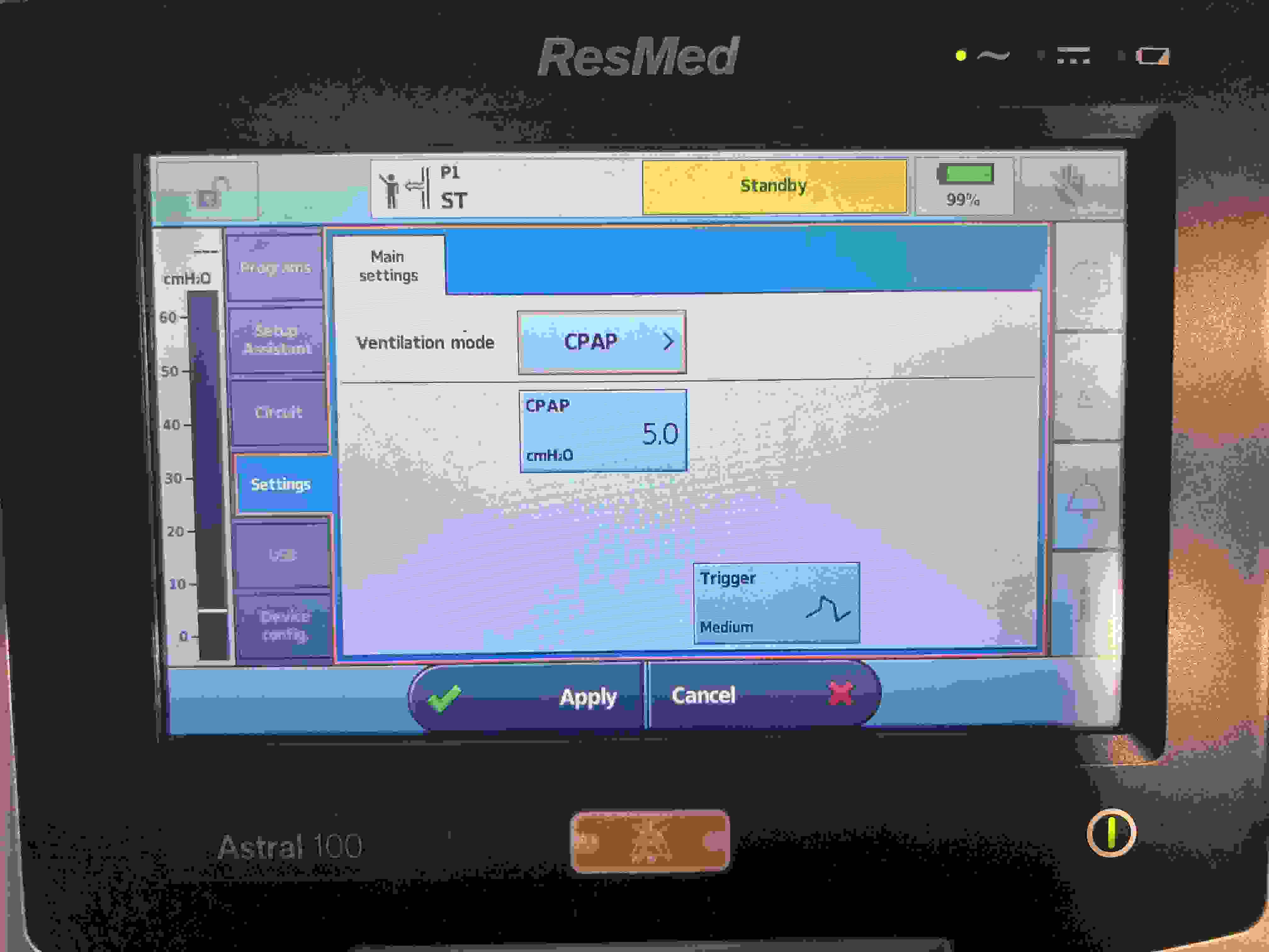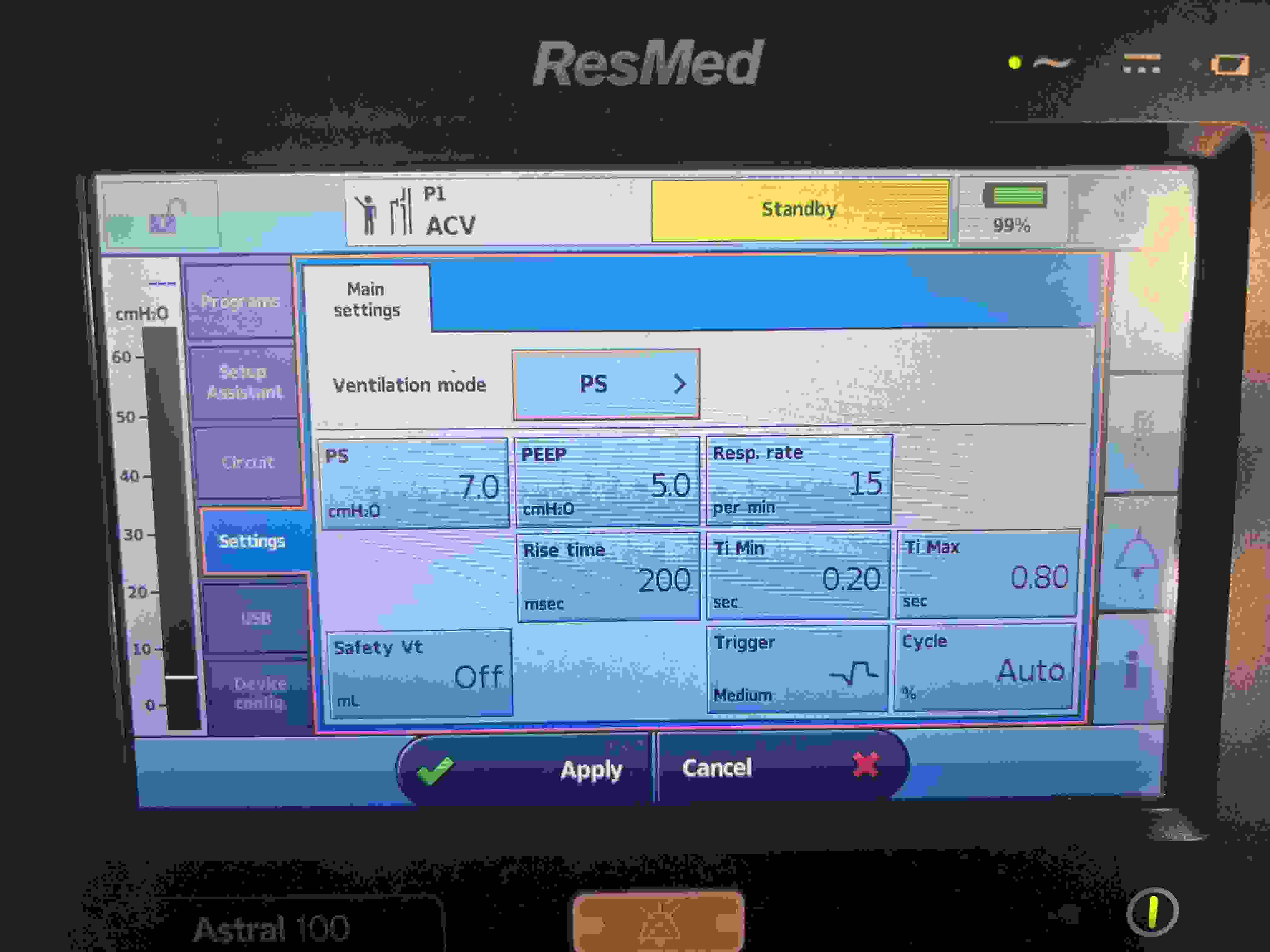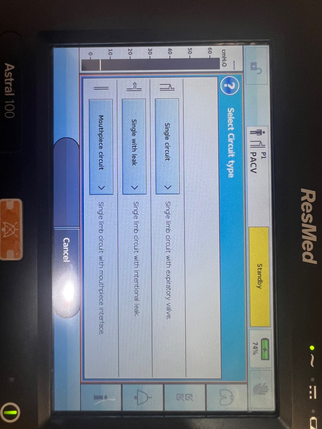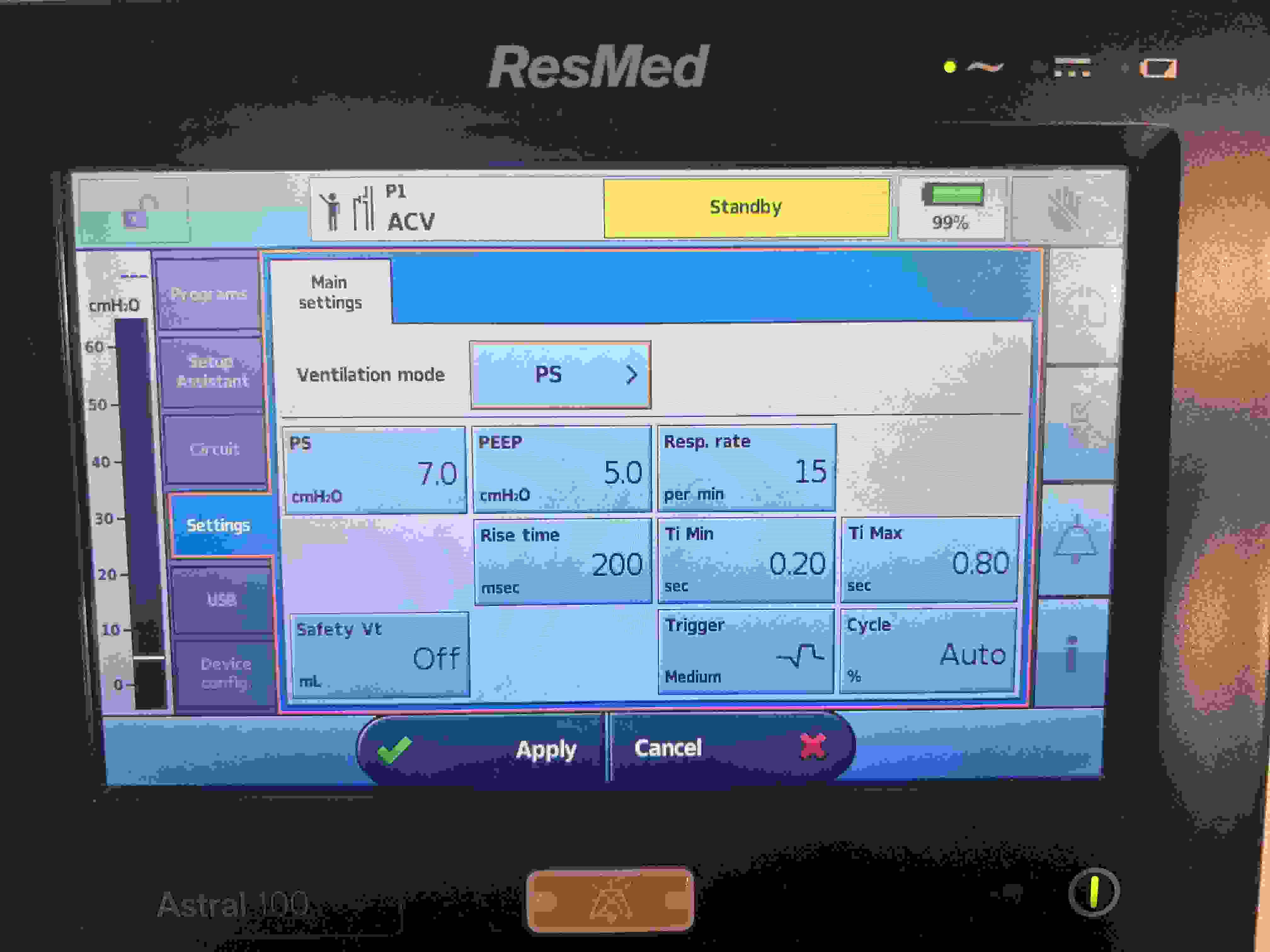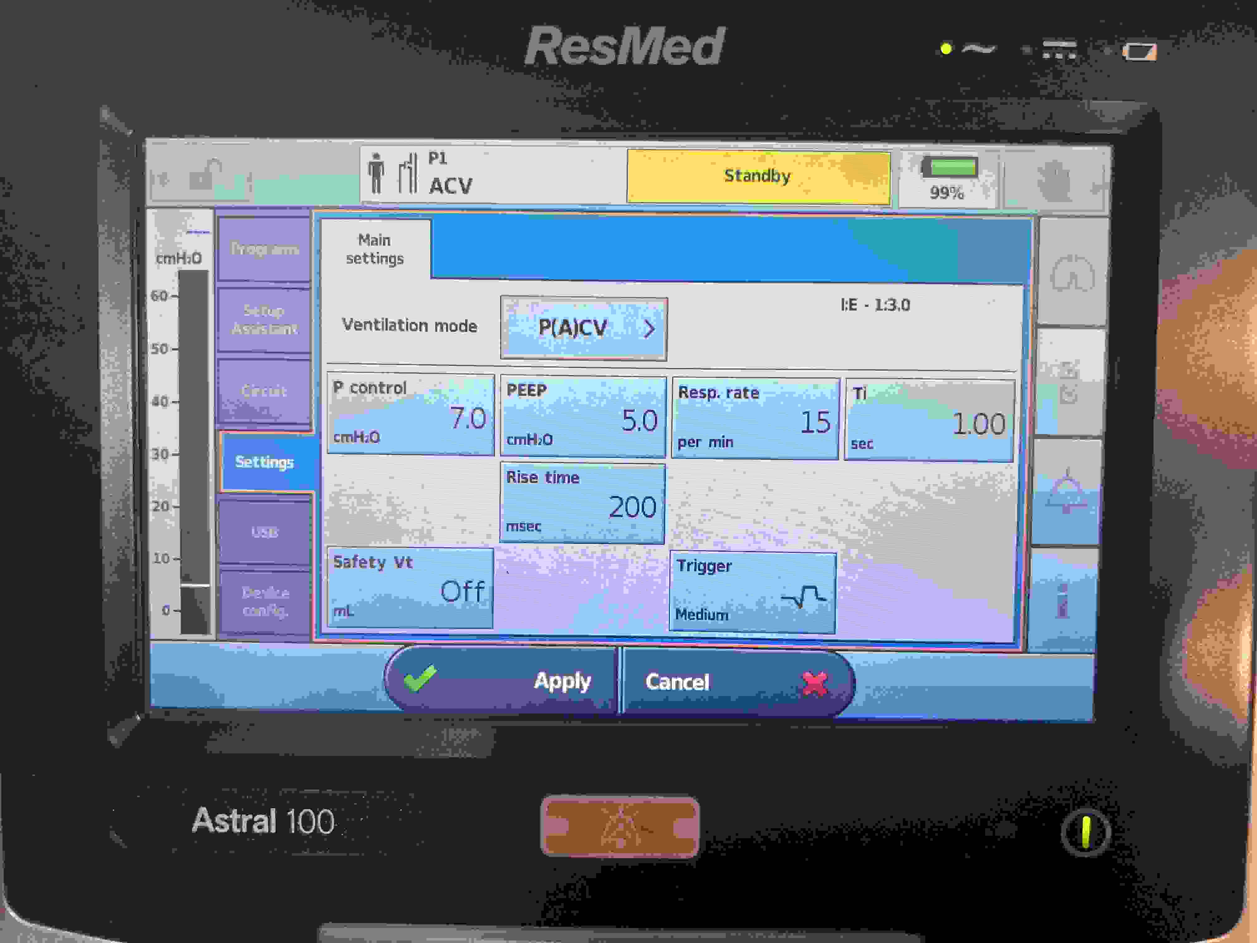 A patient in a stuporous state is receiving mechanical ventilatory support via an Astral 100 device in pressure support (PS) mode. This long-term care setting has limited immediate diagnostics: arterial blood gas analysis and emergency chest radiography are not readily available. In light of these constraints, a plan is being considered to transition the patient from the current invasive ventilator support to a high-flow therapy-capable device (such as the HFT700) that can function as a CPAP/BiPAP machine and also deliver high-flow nasal oxygen. The approach would involve initiating support with BiPAP and, once the patient stabilizes, transitioning to high-flow oxygen therapy.