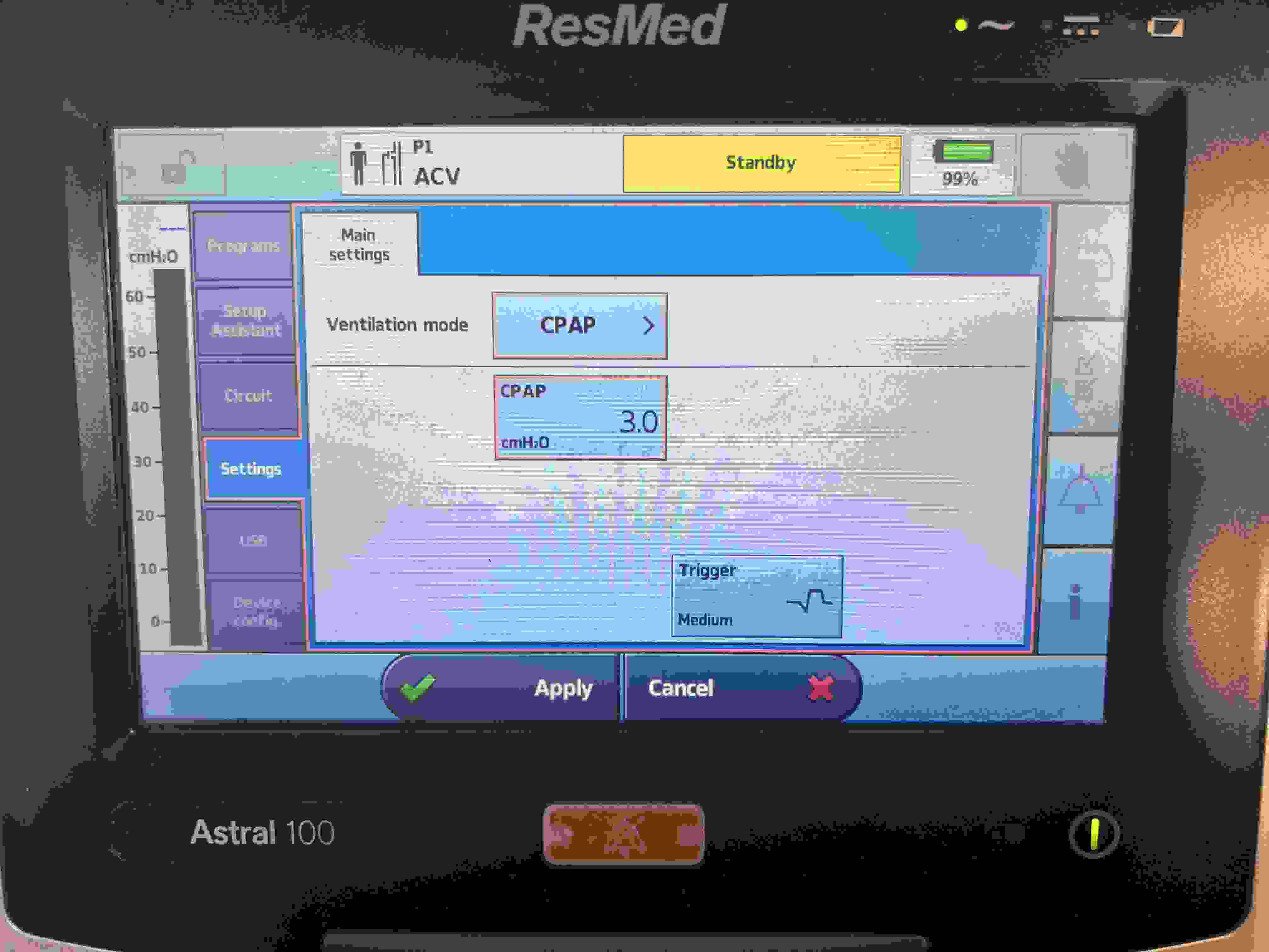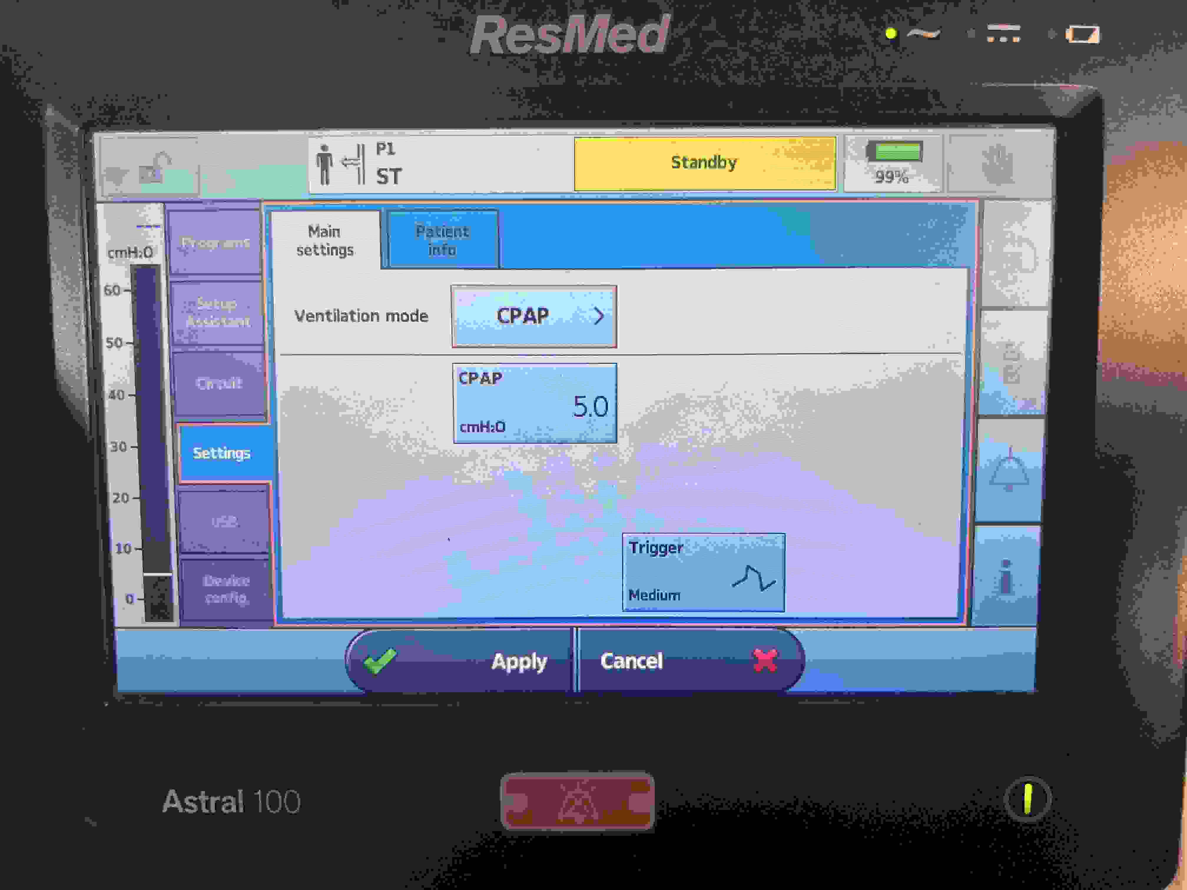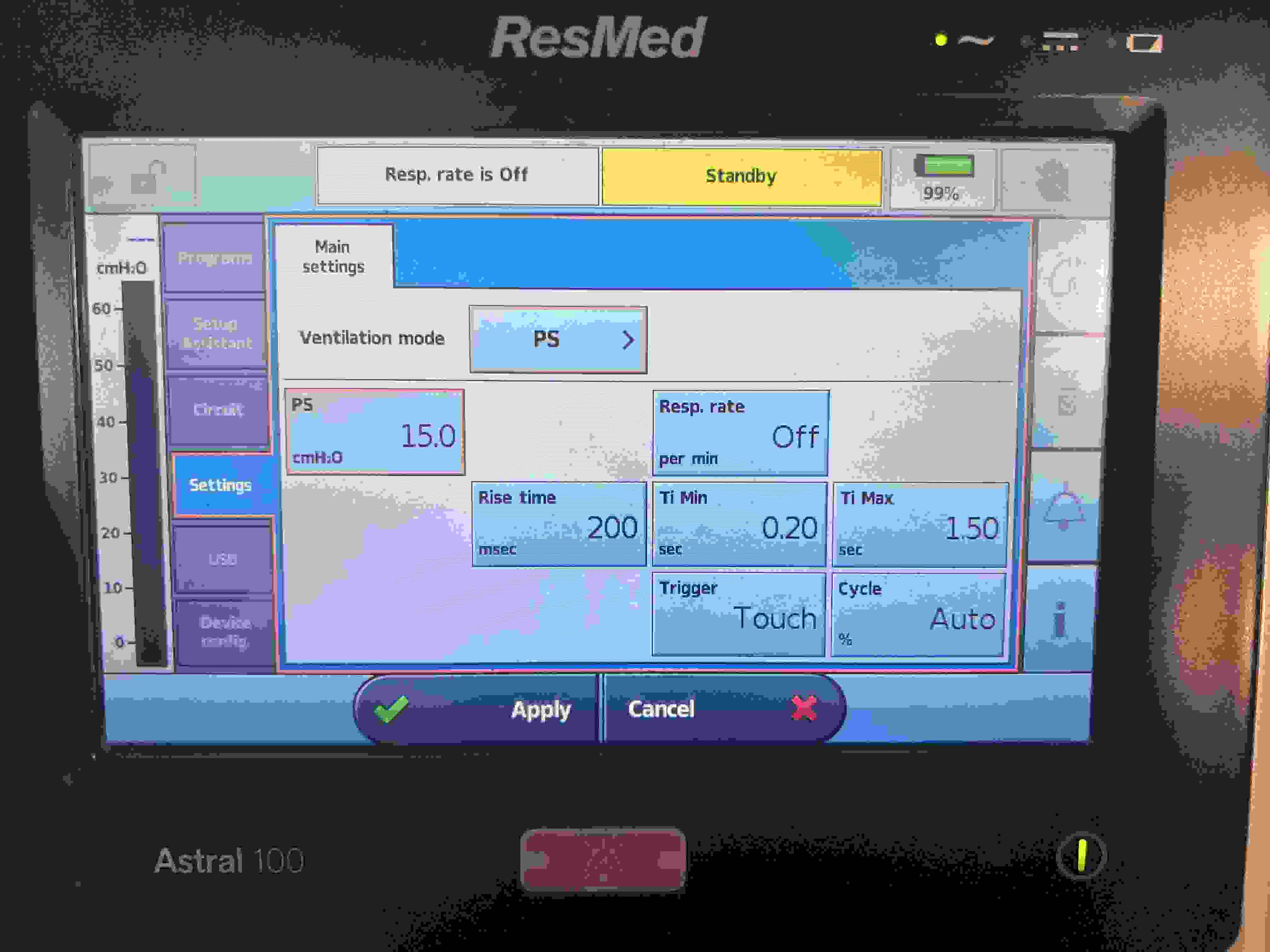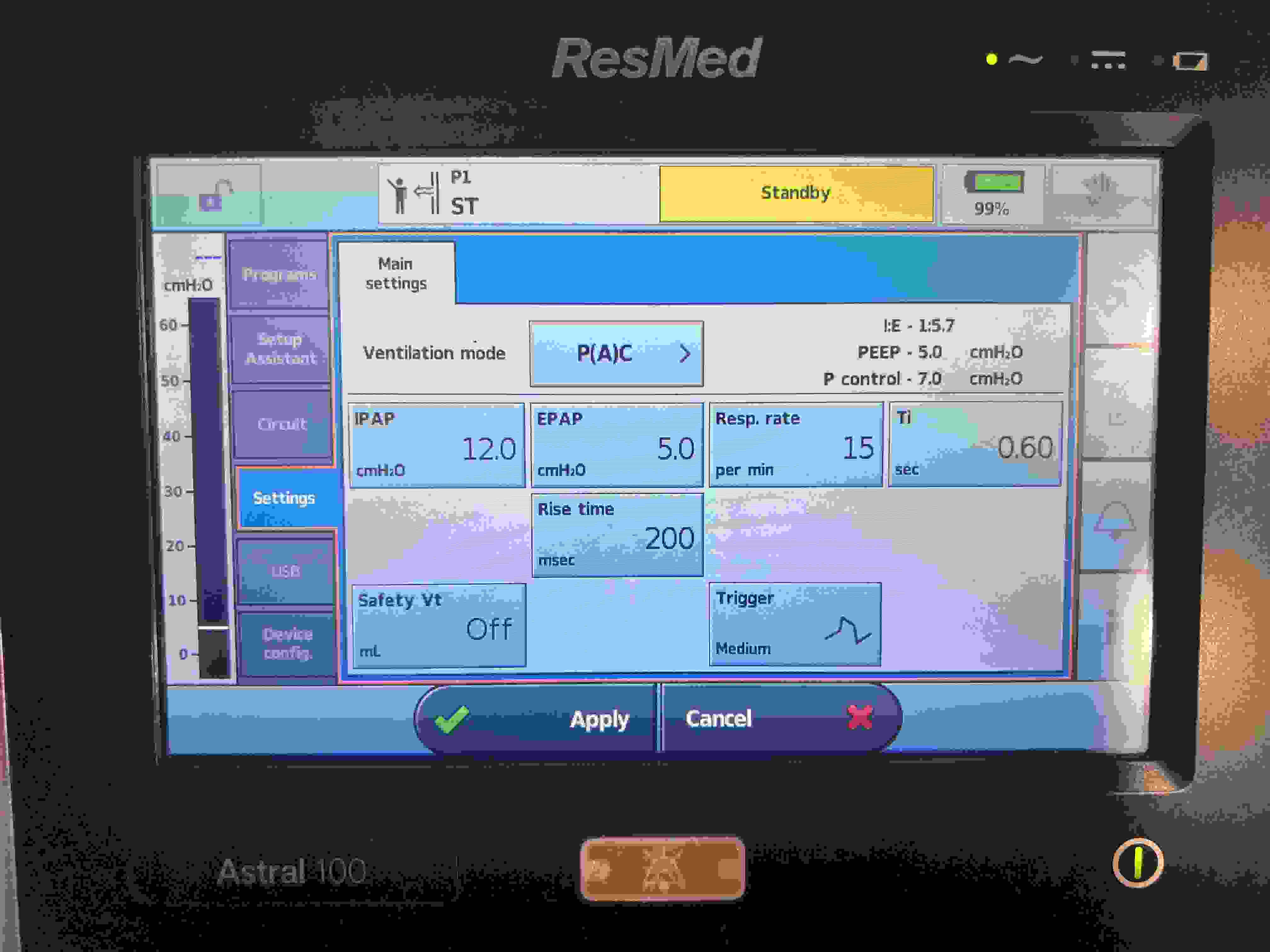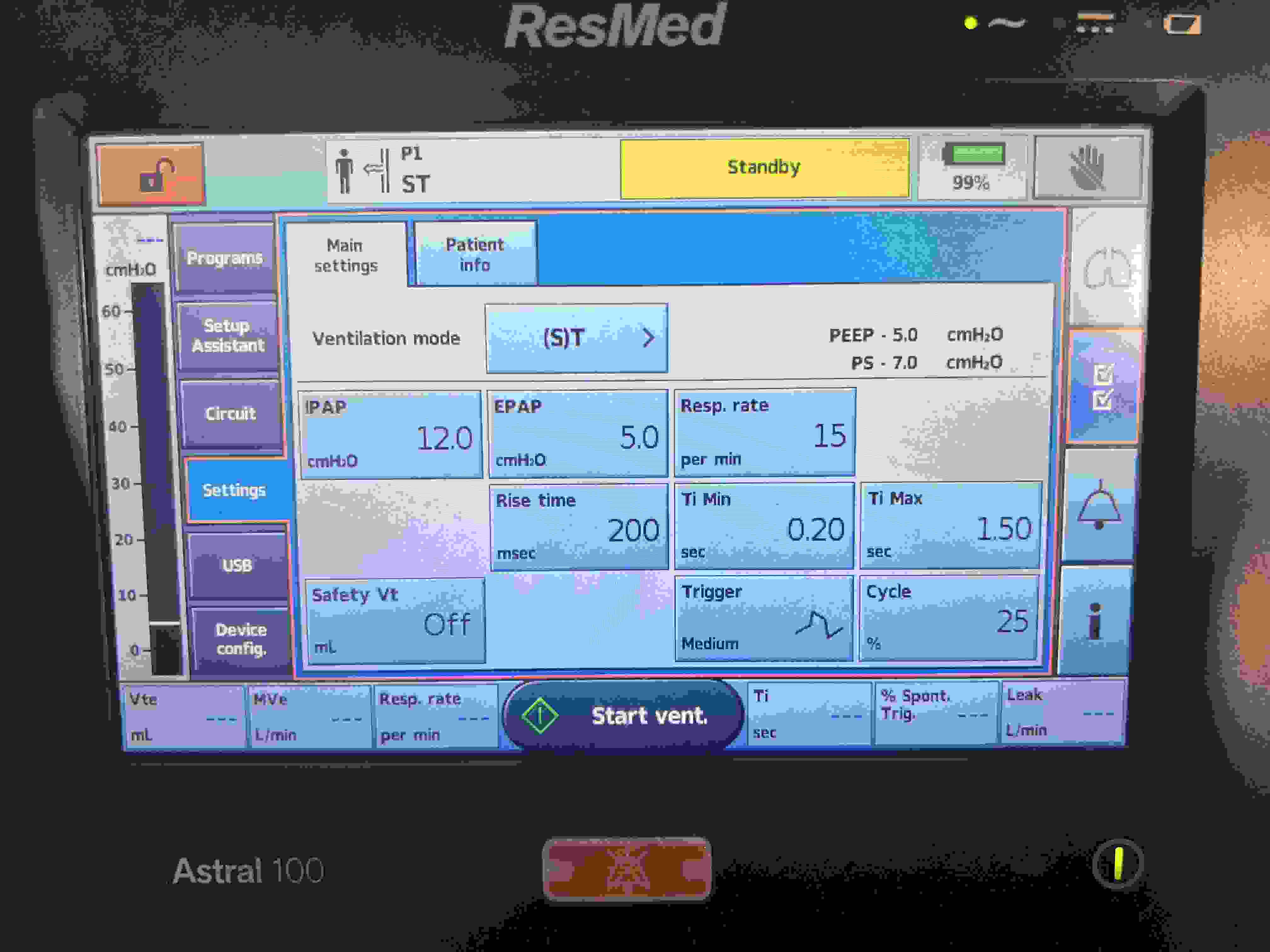 A patient in a stuporous state is receiving mechanical ventilatory support via an Astral 100 device in pressure support (PS) mode. This long-term care setting has limited immediate diagnostics: arterial blood gas analysis and emergency chest radiography are not readily available. In light of these constraints, a plan is being considered to transition the patient from the current invasive ventilator support to a high-flow therapy-capable device (such as the HFT700) that can function as a CPAP/BiPAP machine and also deliver high-flow nasal oxygen. The approach would involve initiating support with BiPAP and, once the patient stabilizes, transitioning to high-flow oxygen therapy.