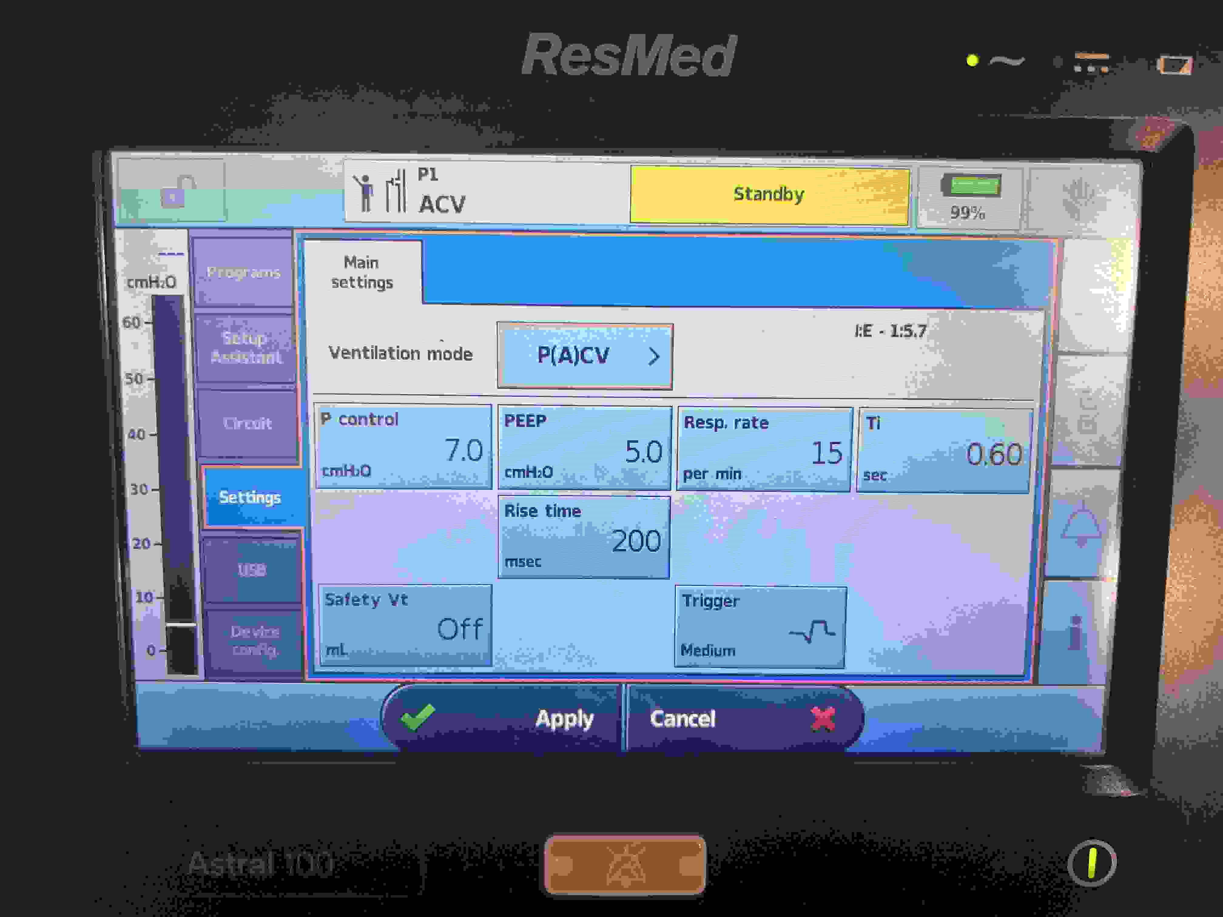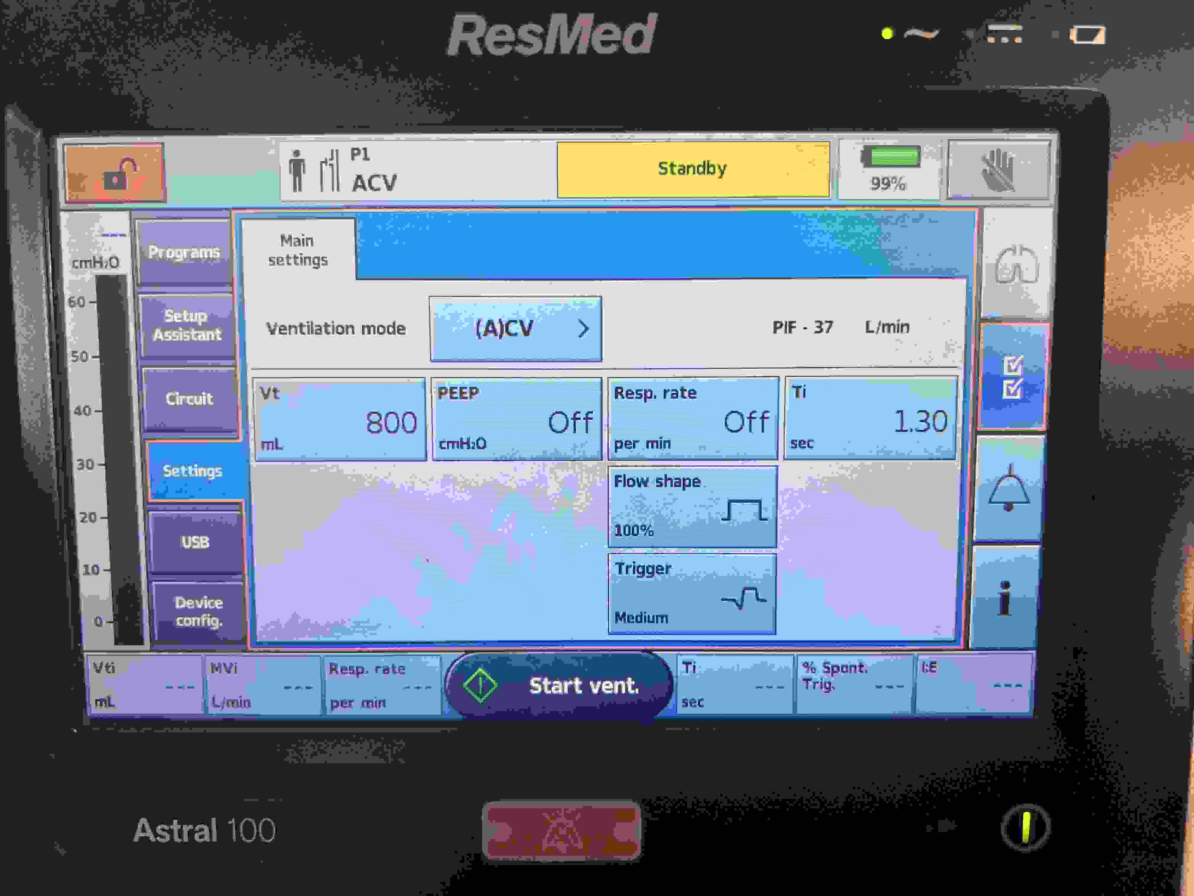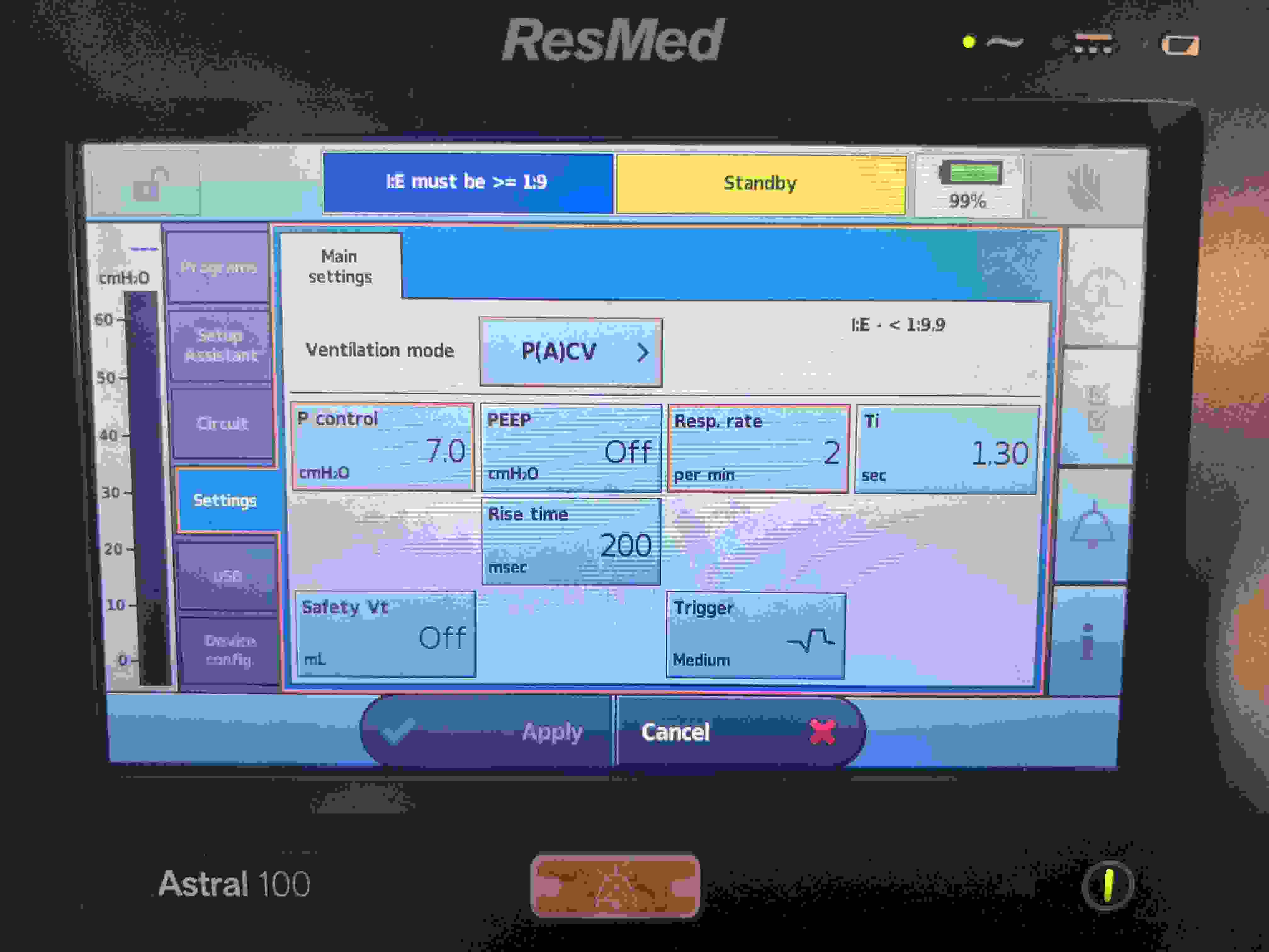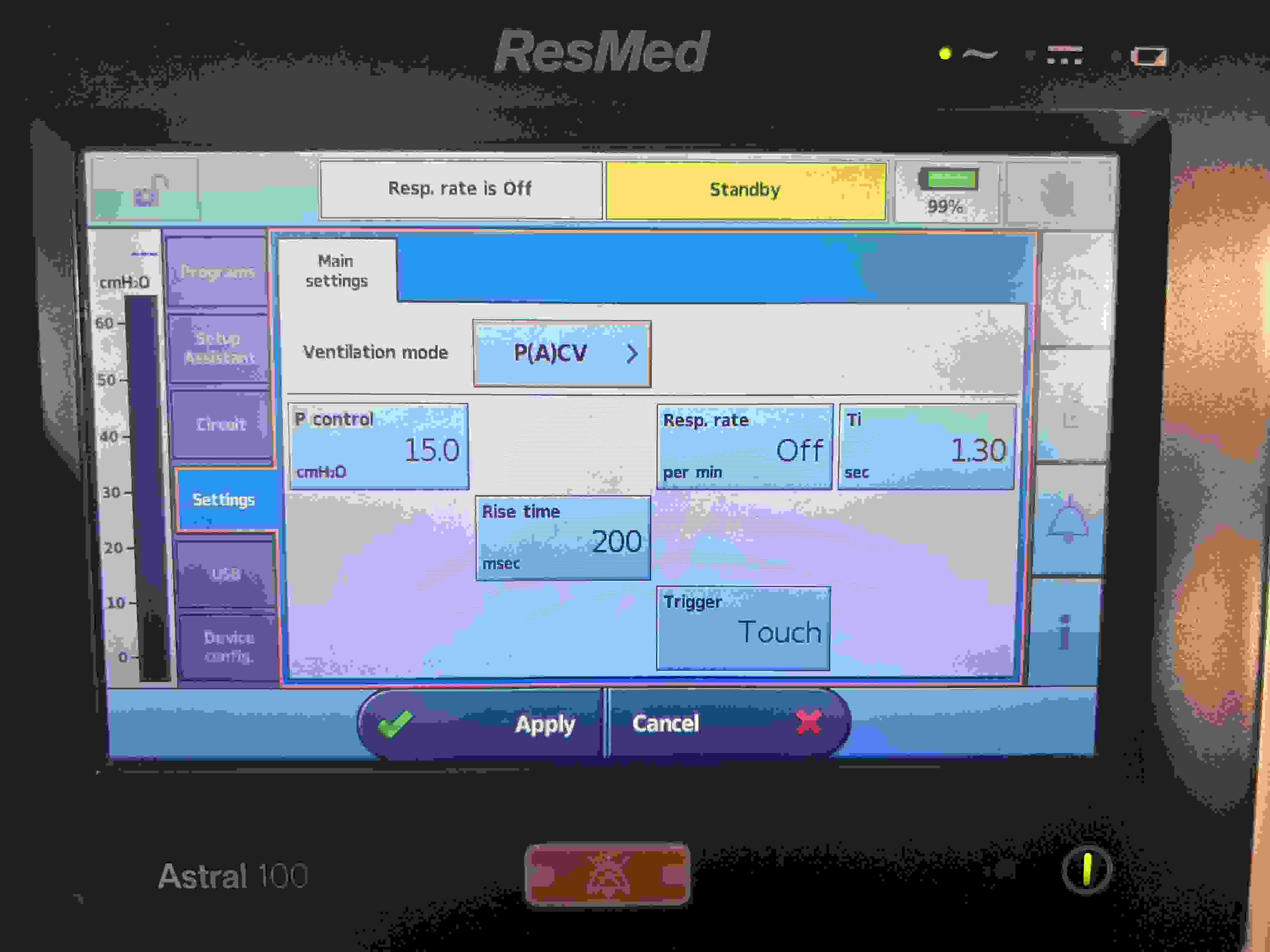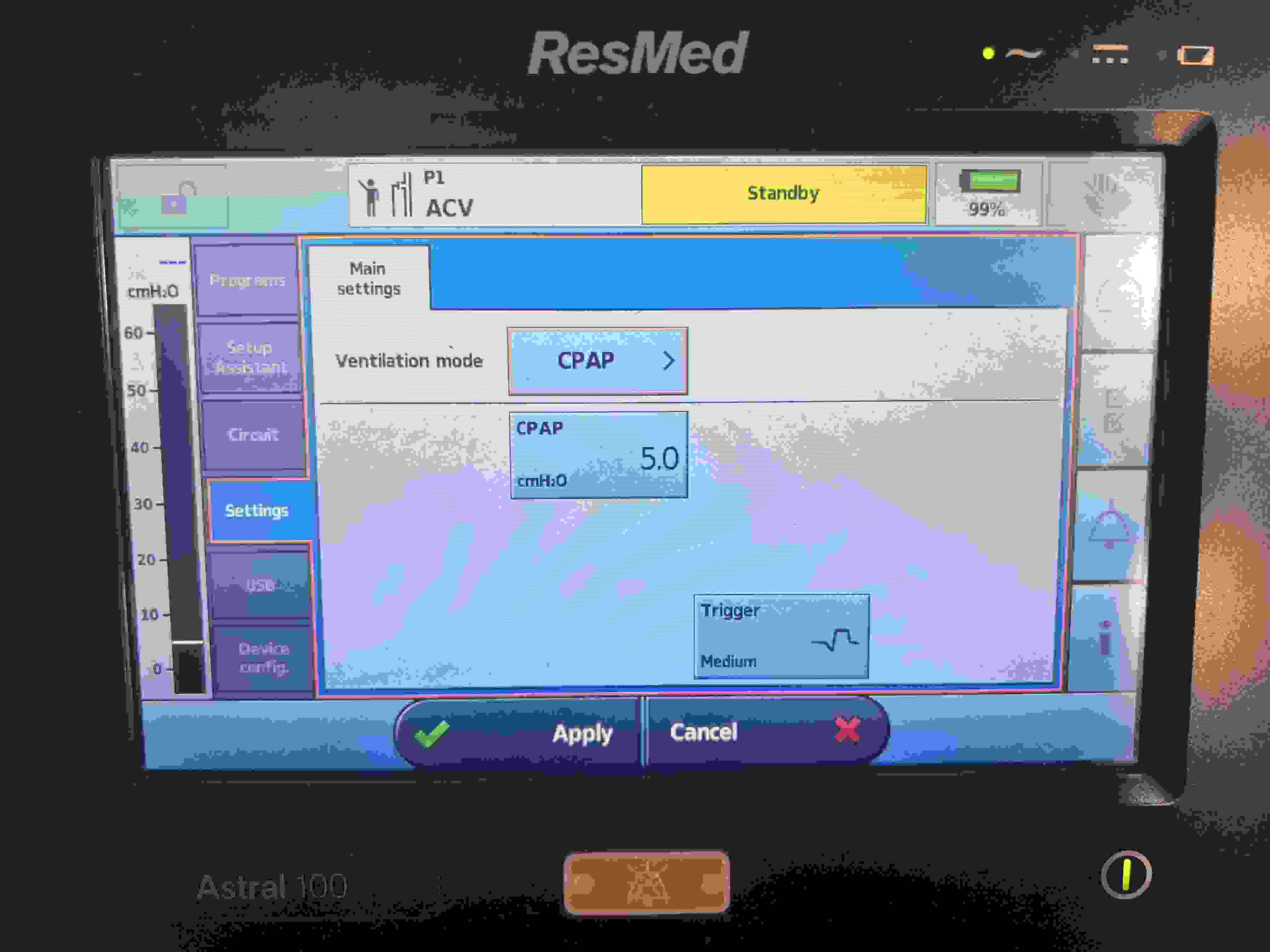 A patient in a stuporous state is receiving mechanical ventilatory support via an Astral 100 device in pressure support (PS) mode. This long-term care setting has limited immediate diagnostics: arterial blood gas analysis and emergency chest radiography are not readily available. In light of these constraints, a plan is being considered to transition the patient from the current invasive ventilator support to a high-flow therapy-capable device (such as the HFT700) that can function as a CPAP/BiPAP machine and also deliver high-flow nasal oxygen. The approach would involve initiating support with BiPAP and, once the patient stabilizes, transitioning to high-flow oxygen therapy.