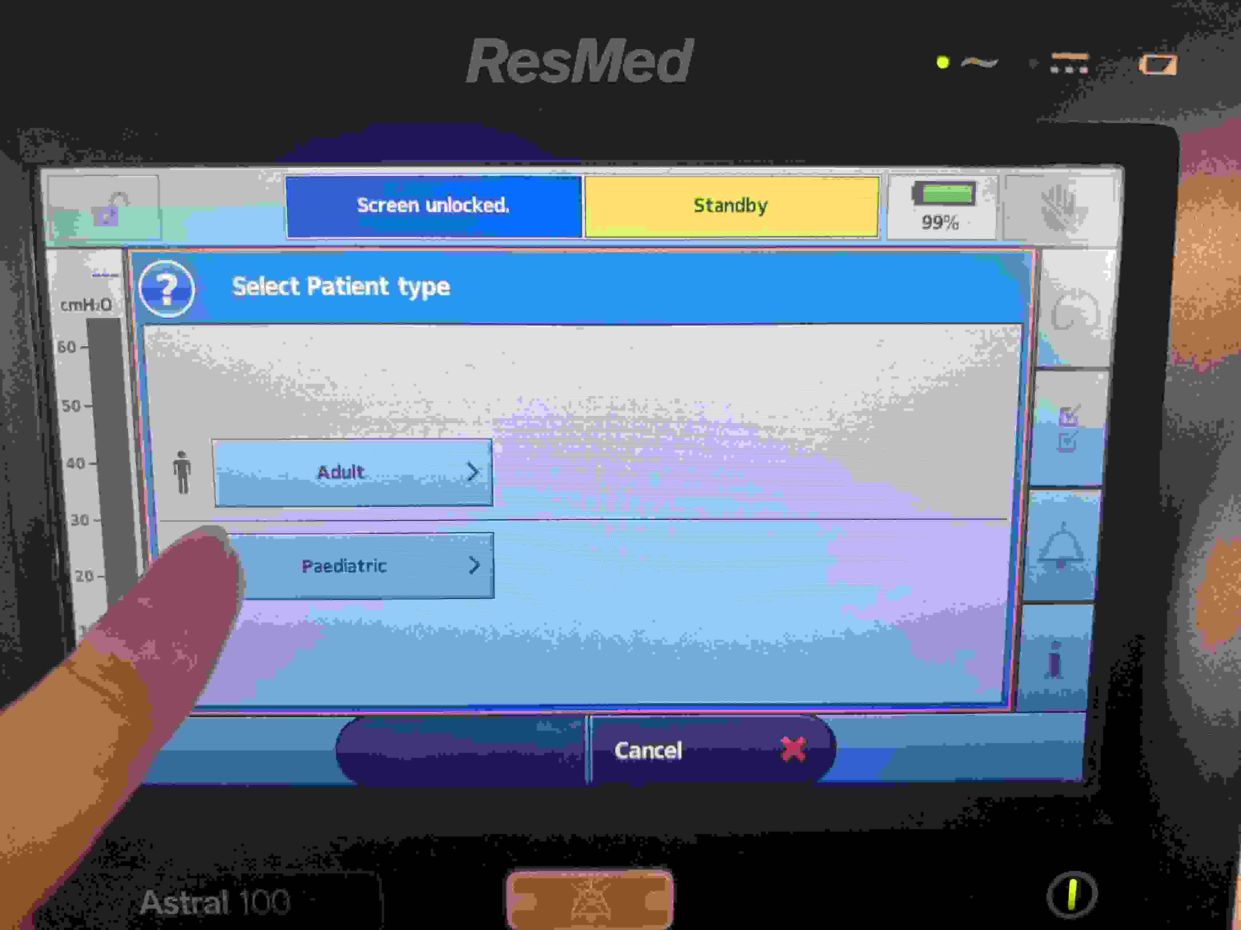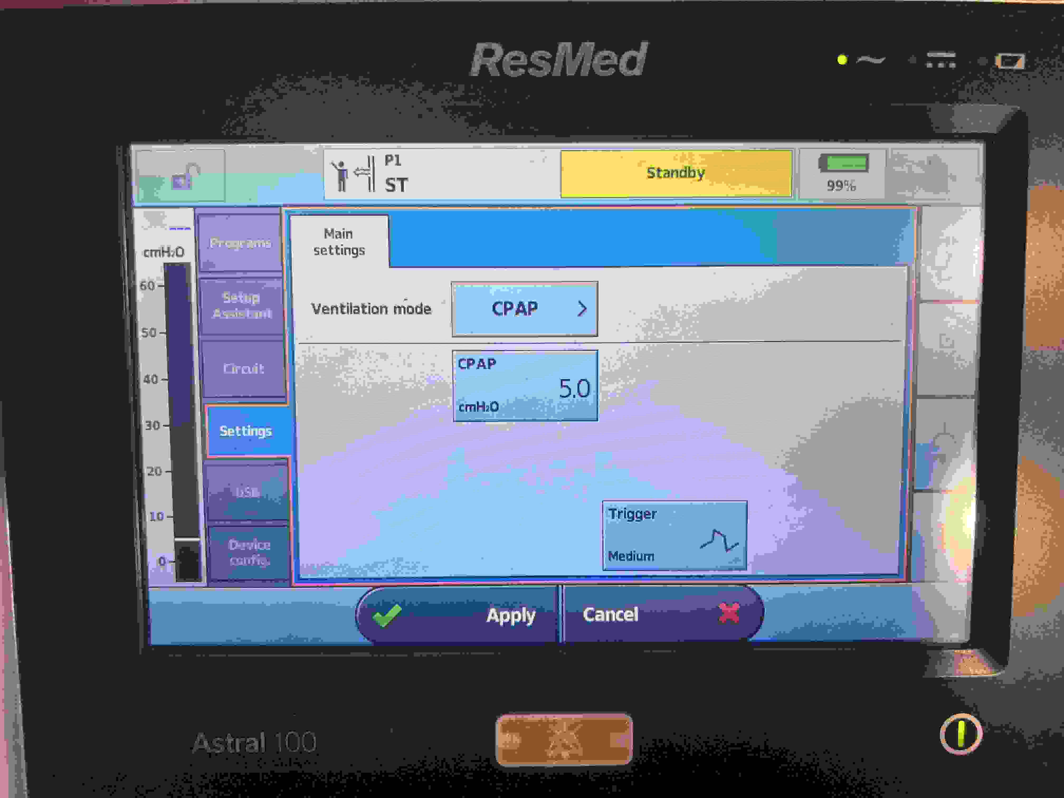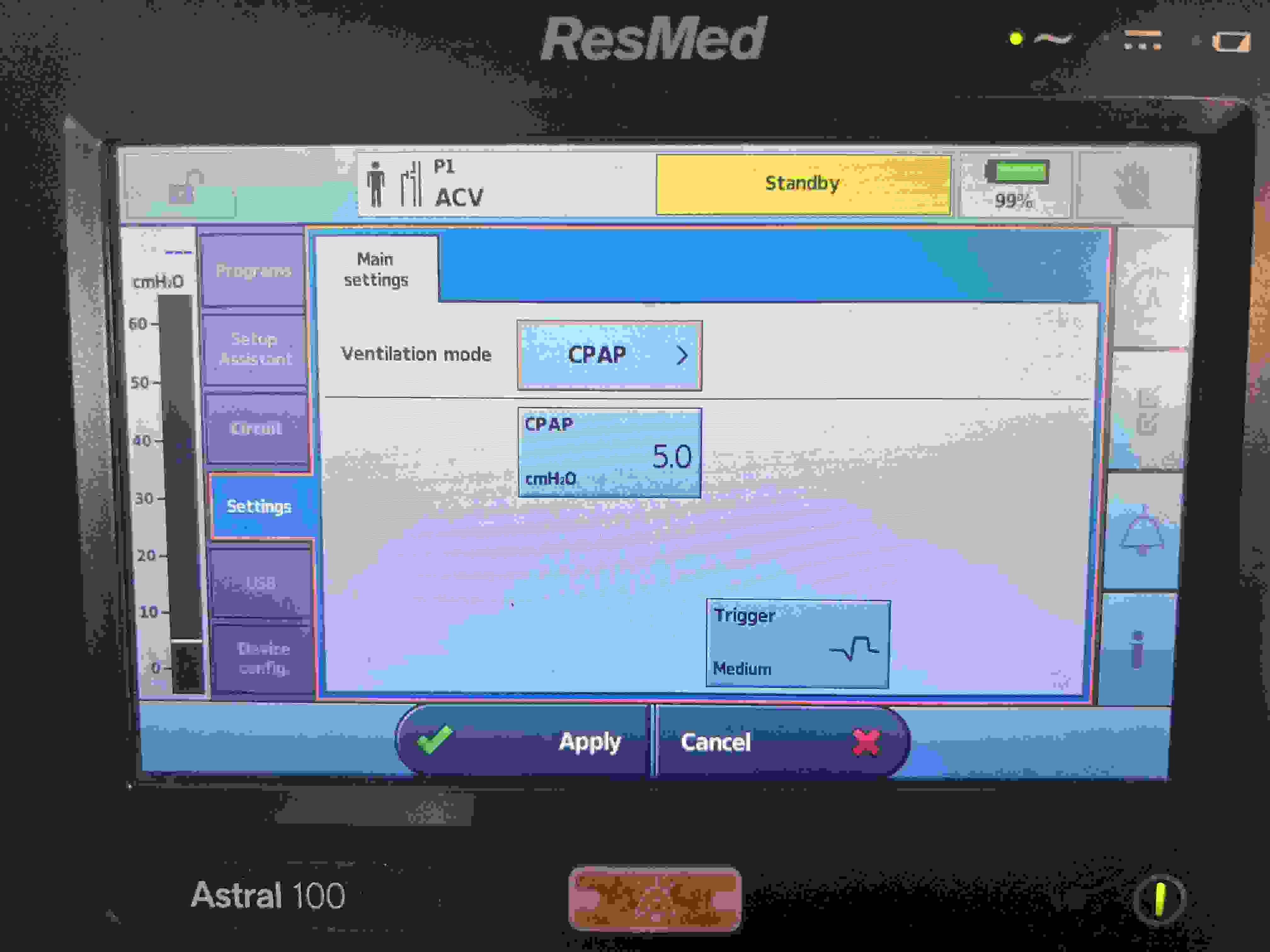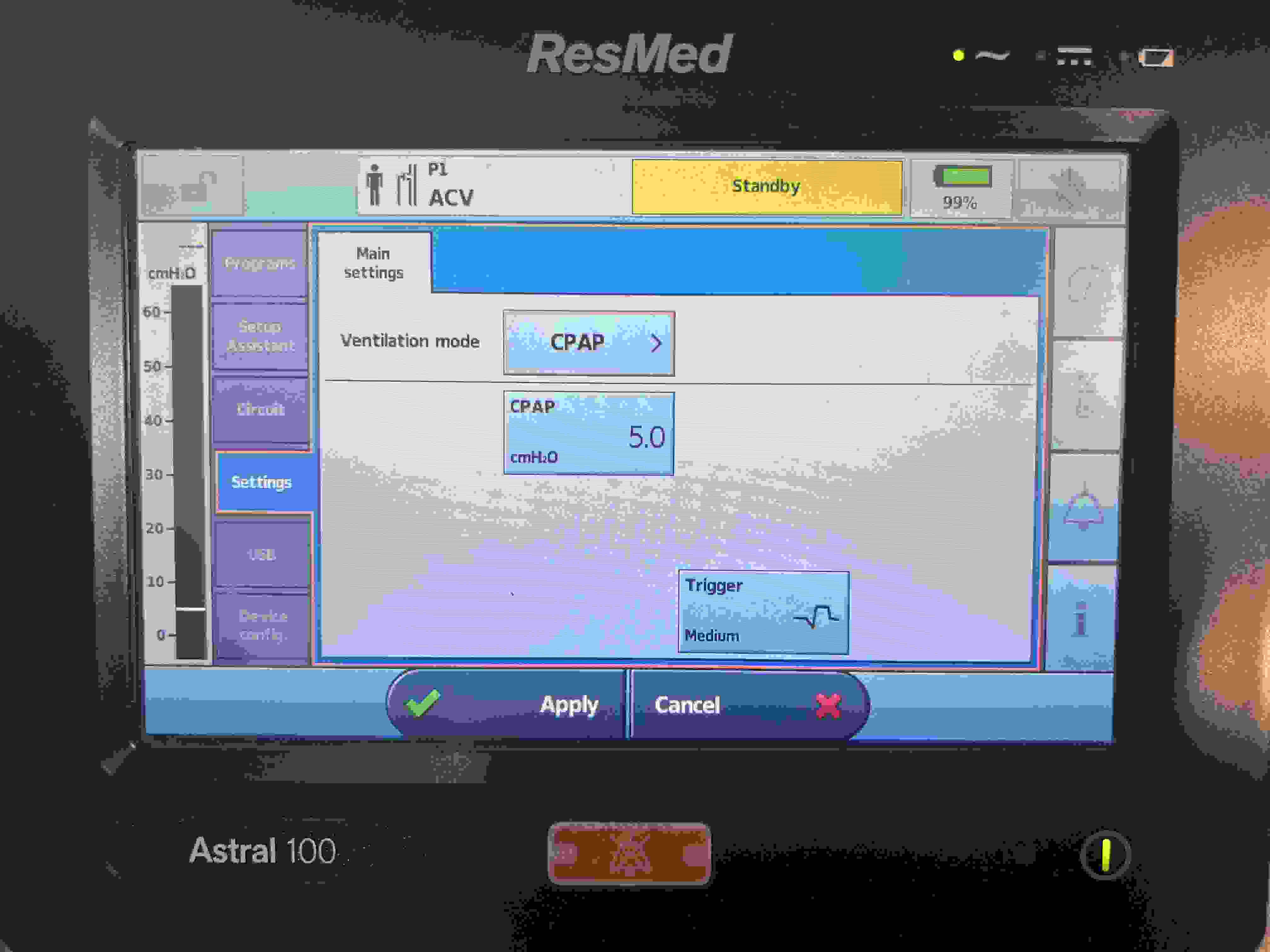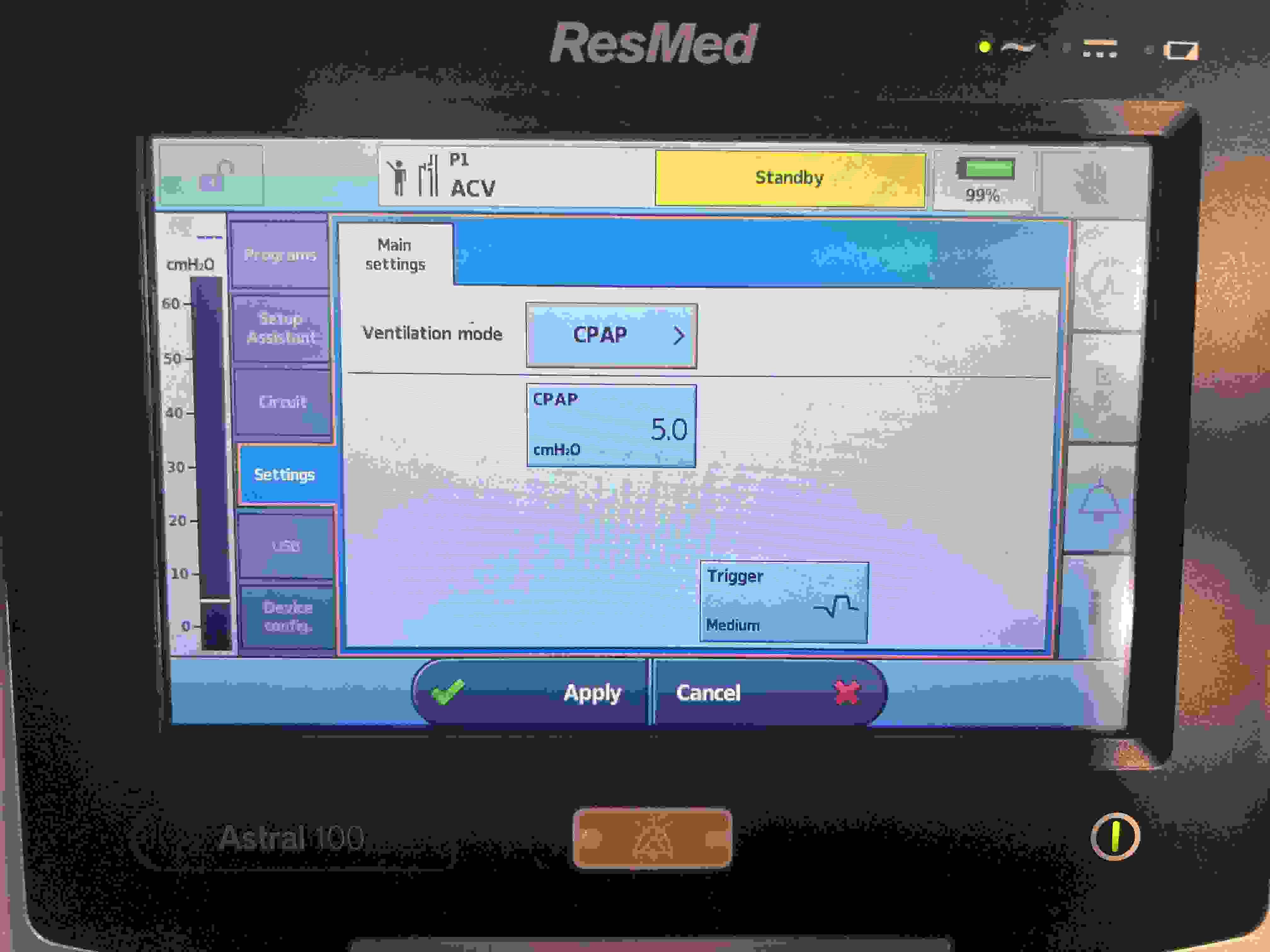 A patient in a stuporous state is receiving mechanical ventilatory support via an Astral 100 device in pressure support (PS) mode. This long-term care setting has limited immediate diagnostics: arterial blood gas analysis and emergency chest radiography are not readily available. In light of these constraints, a plan is being considered to transition the patient from the current invasive ventilator support to a high-flow therapy-capable device (such as the HFT700) that can function as a CPAP/BiPAP machine and also deliver high-flow nasal oxygen. The approach would involve initiating support with BiPAP and, once the patient stabilizes, transitioning to high-flow oxygen therapy.