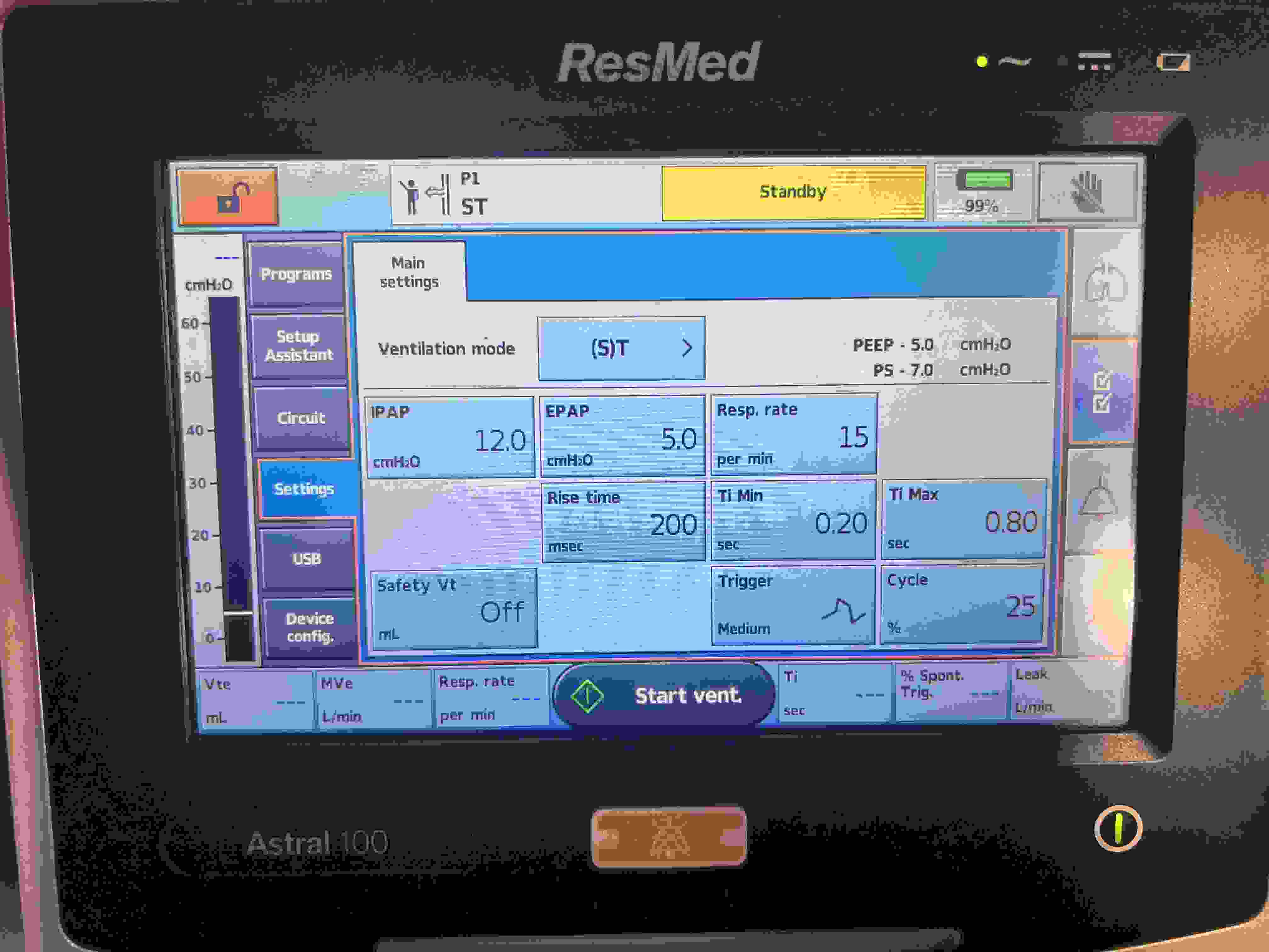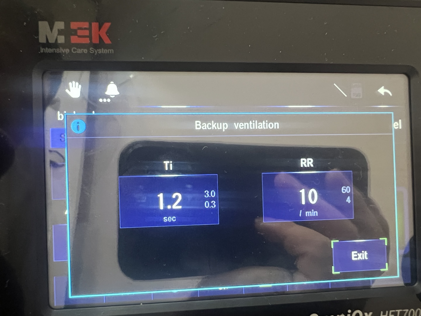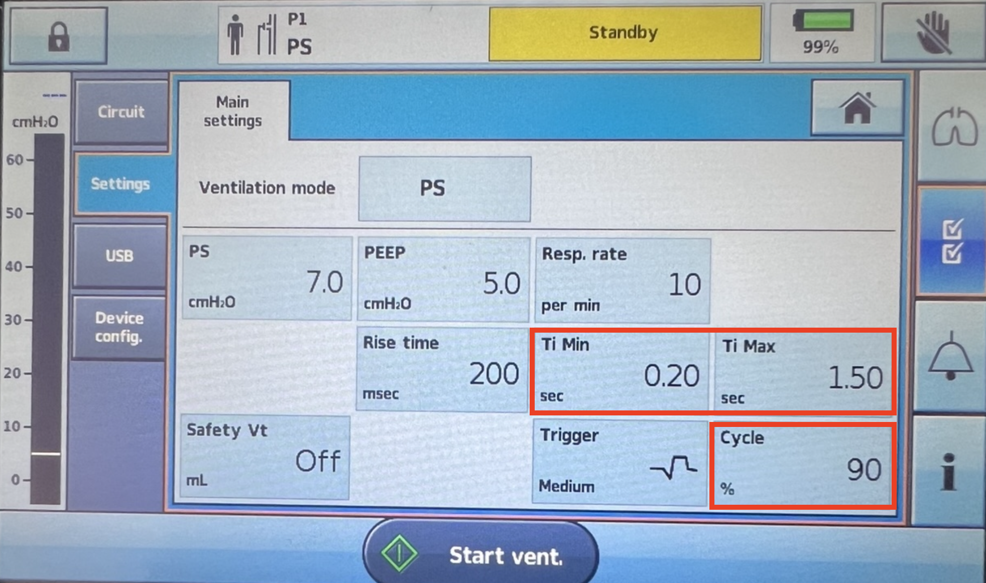 - Inspiratory time (Ti): Extending Ti to 1.6 s improved oxygenation; however, monitor for auto-PEEP and patient–ventilator asynchrony. Typical Ti in neurogenic hypoventilation is 1.0–1.5 s; titrate in 0.1 s increments.