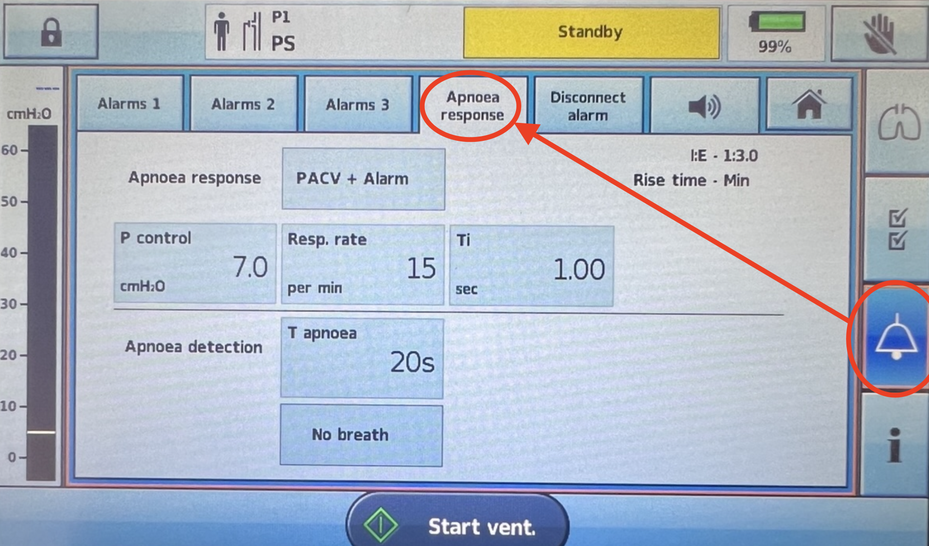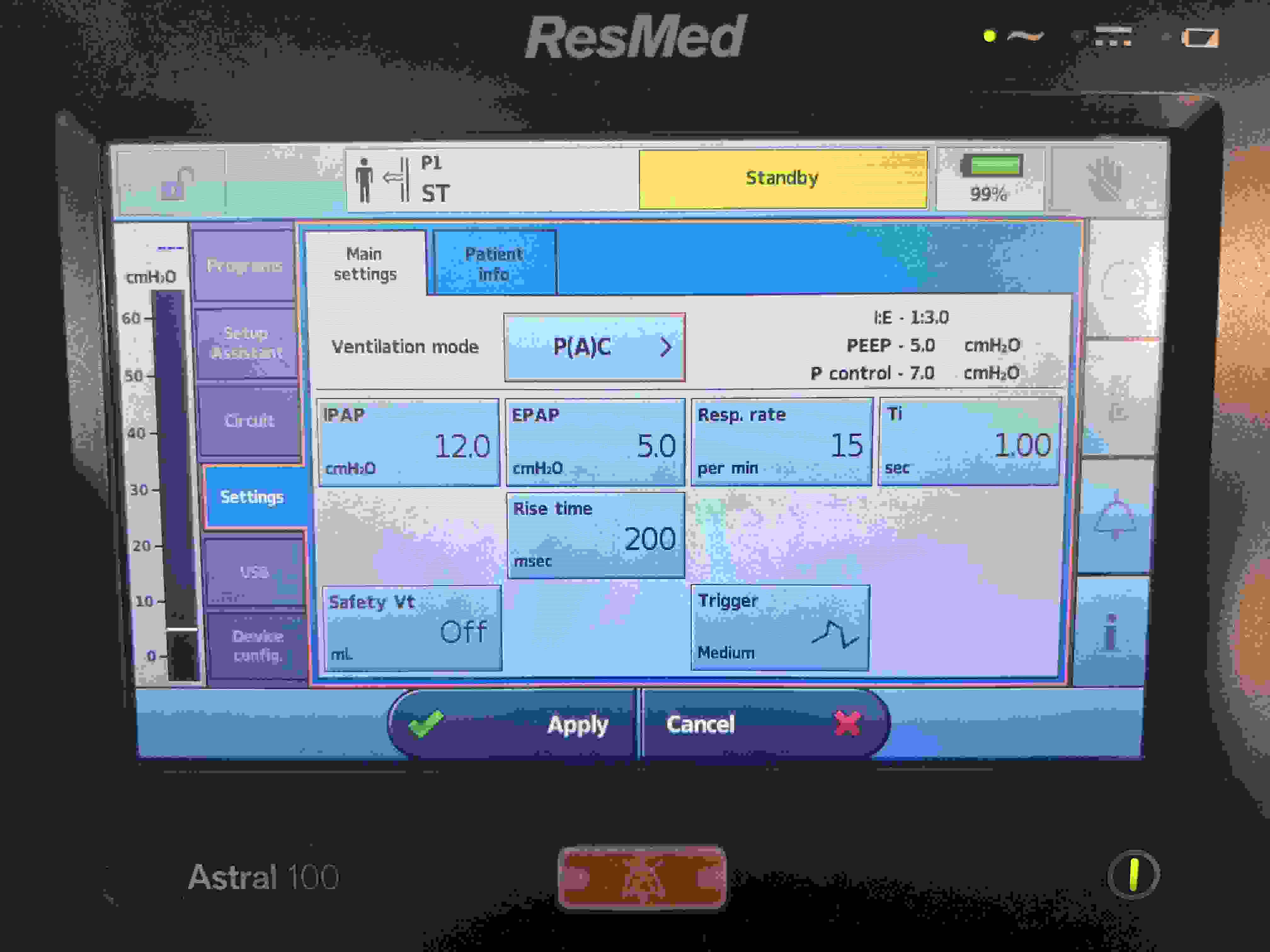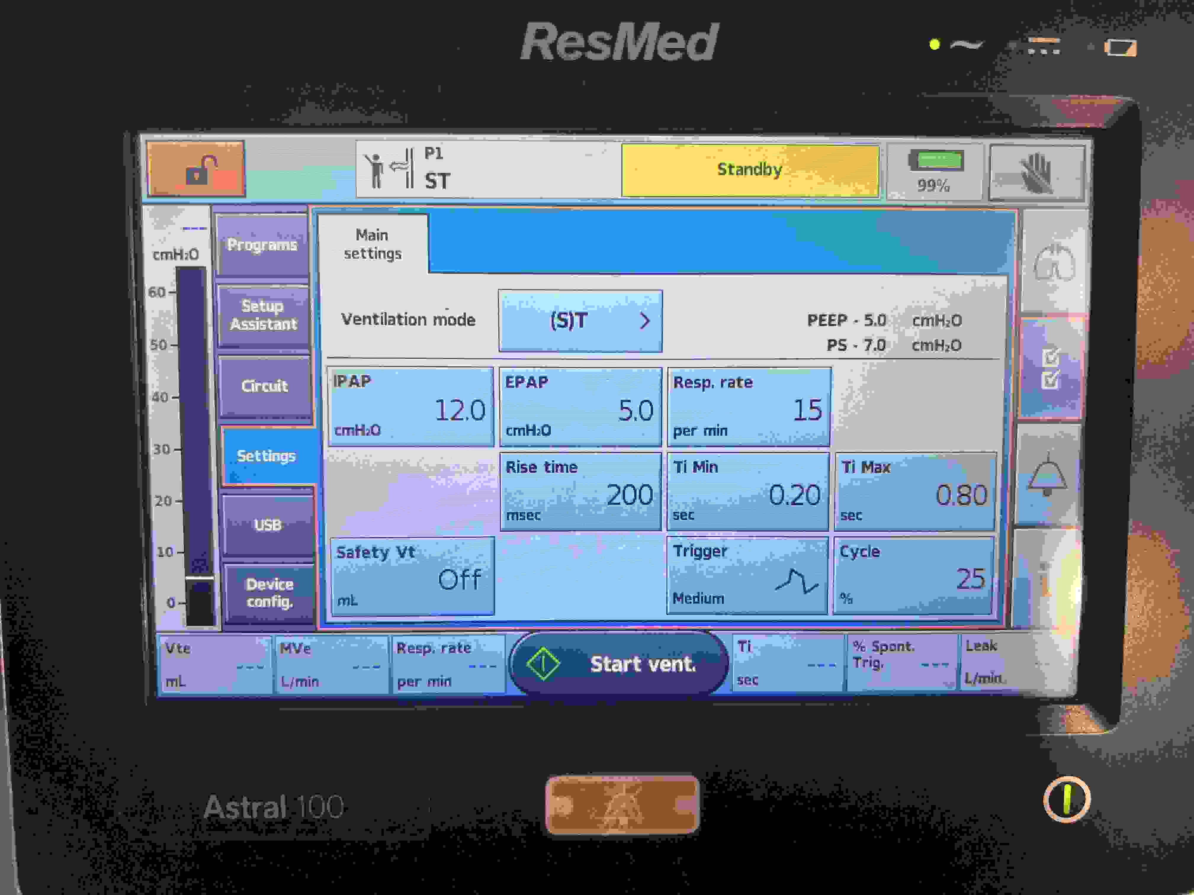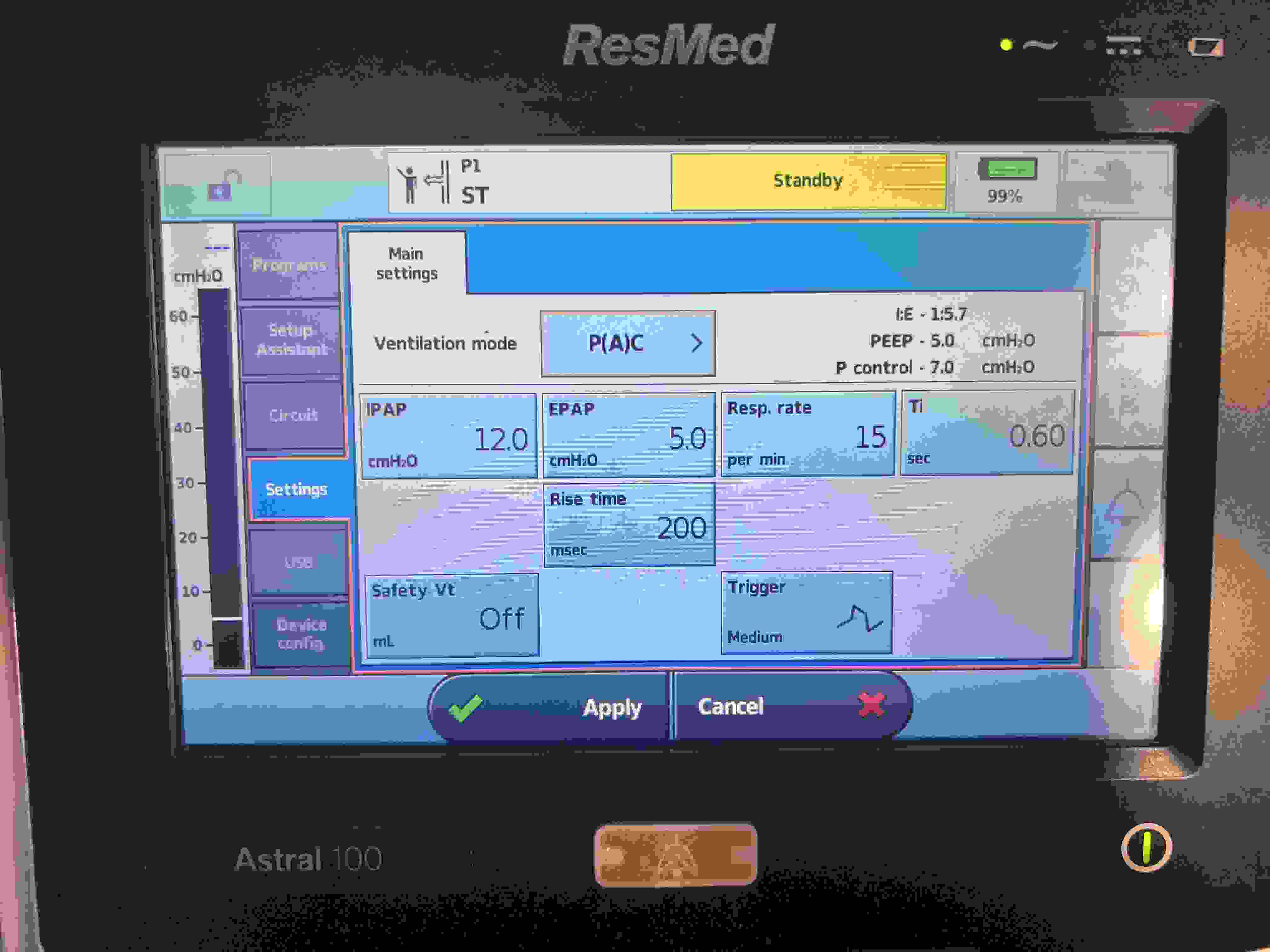 - Inspiratory time (Ti): Extending Ti to 1.6 s improved oxygenation; however, monitor for auto-PEEP and patient–ventilator asynchrony. Typical Ti in neurogenic hypoventilation is 1.0–1.5 s; titrate in 0.1 s increments.