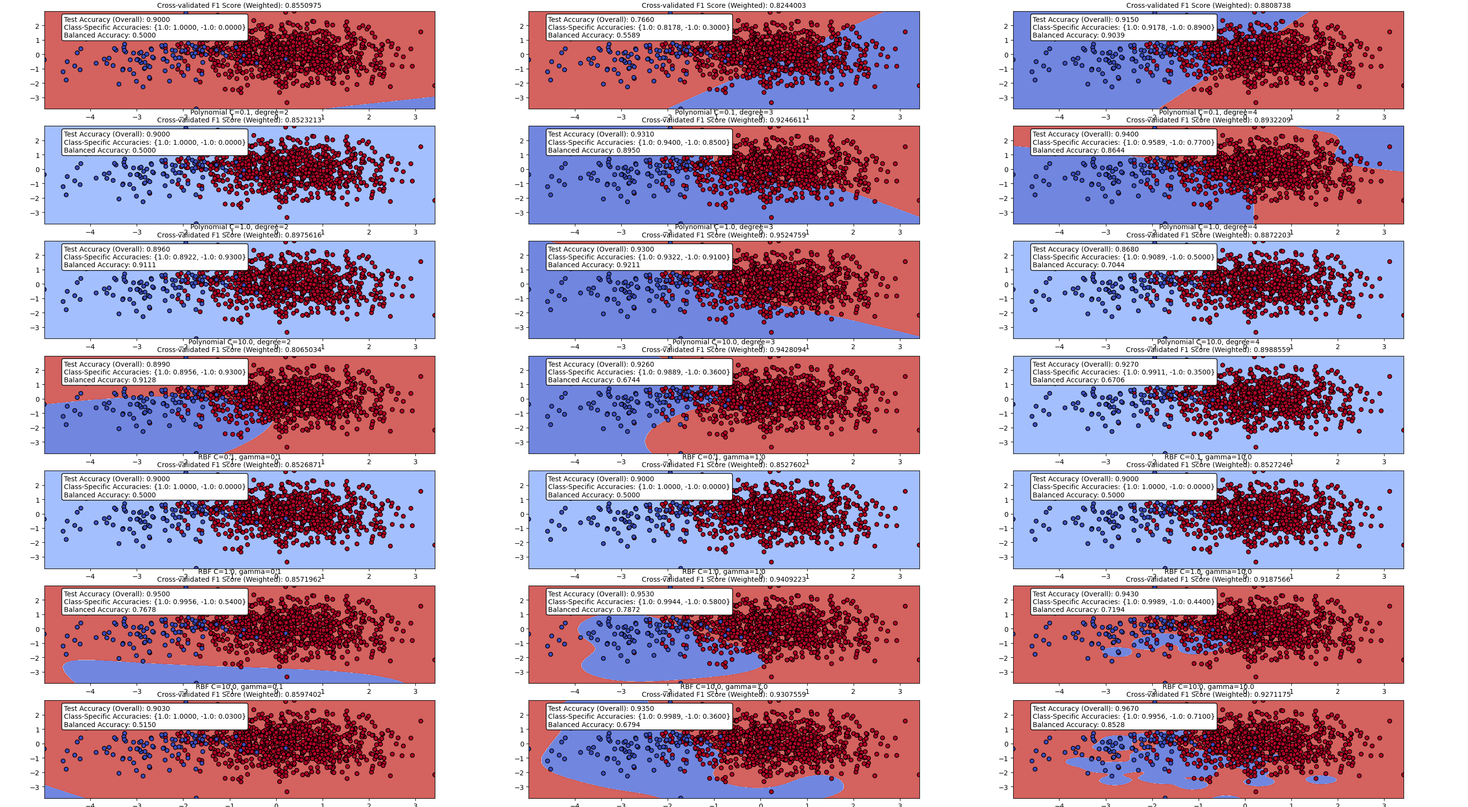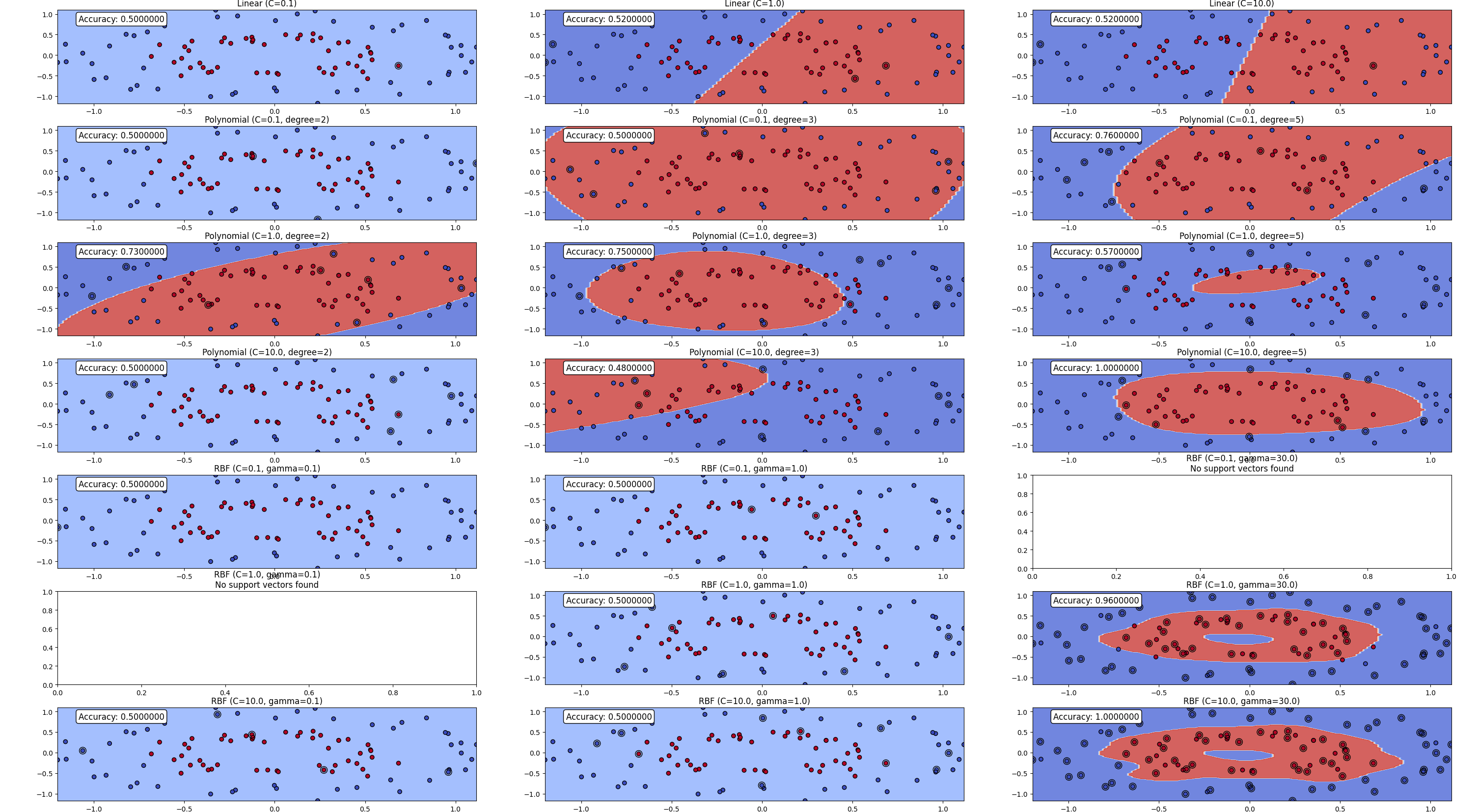 print(f"Testing with C={C}, Kernel={kernel}, Gamma={gamma}, Degree={degree}")