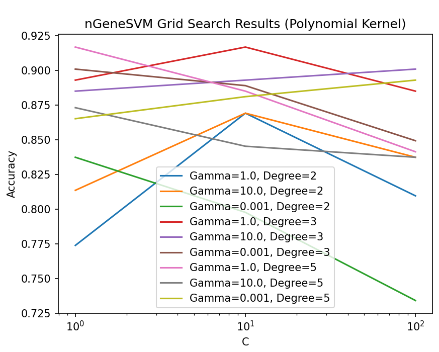 The performance of the nGeneSVM_OvA was tested using a grid search approach to find the optimal hyperparameters for the SVM models. The grid search spanned a variety of configurations, including different kernel types (linear, polynomial, and RBF), as well as varying values for the regularization parameter C, the degree of the polynomial kernel, and the gamma parameter for the RBF kernel.